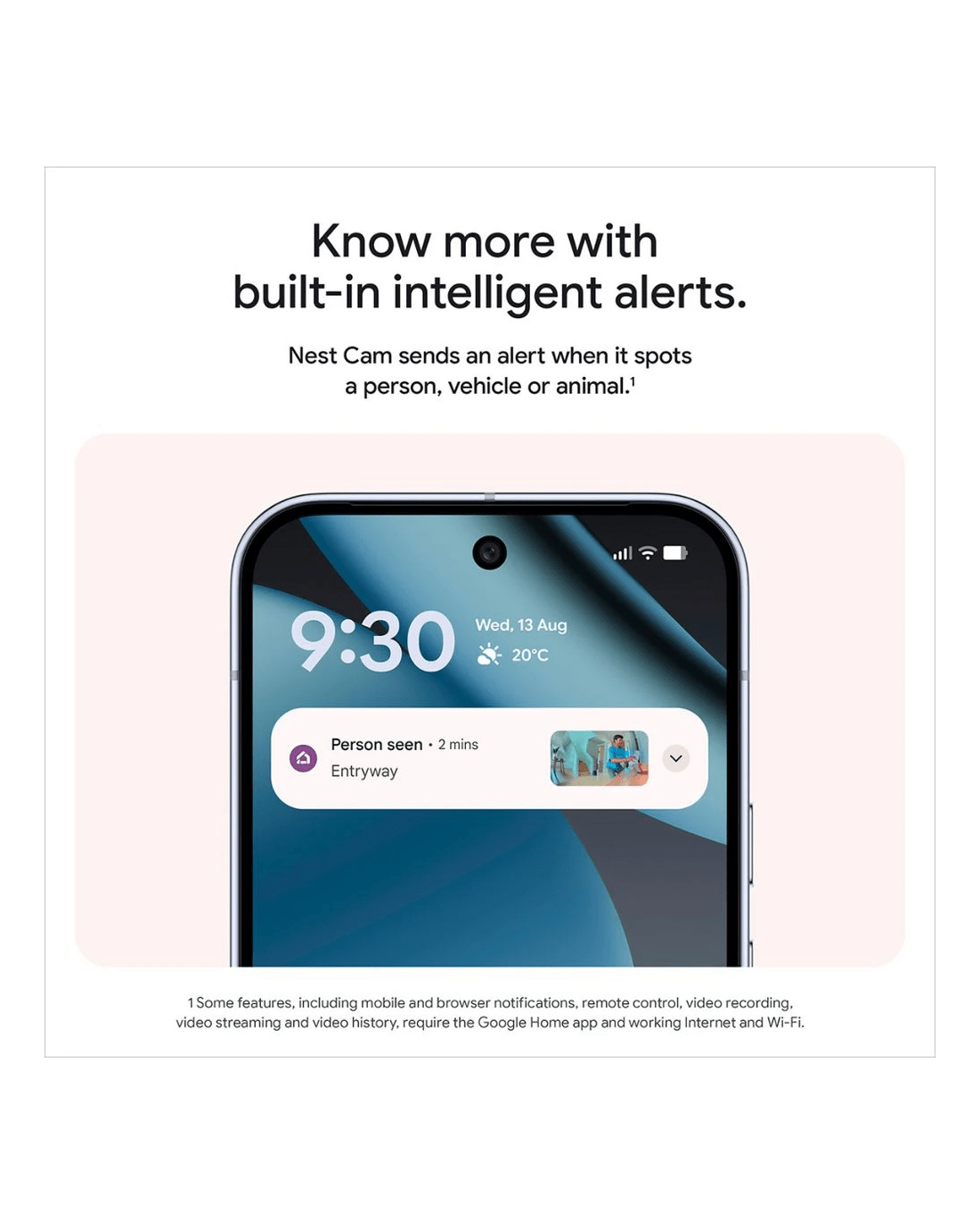 The Google Nest Cam Indoor is designed to help you look after your home and family – even when you’re away, it knows the difference between a person and a pet, and alerts you about the things that matter to you*. View 24/7 live HD video from anywhere, plus replay video recordings, talk to visitors and more, all from the Google Home app**. And with up to three hours of free event video history, you can go back and see what you've missed***.