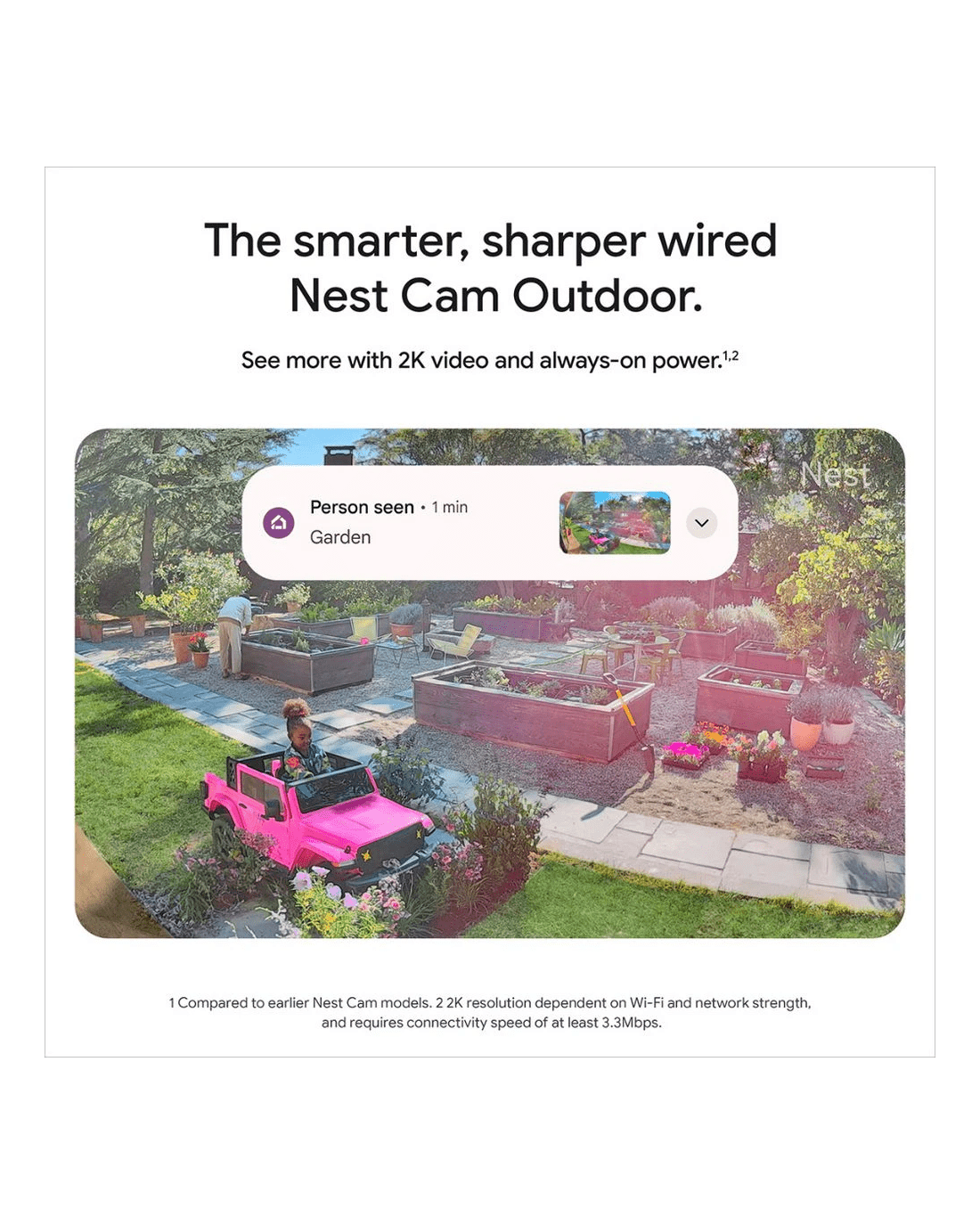 - Google Nest Cam Outdoor can tell the difference between a person and a pet, so you can get more helpful notifications*.