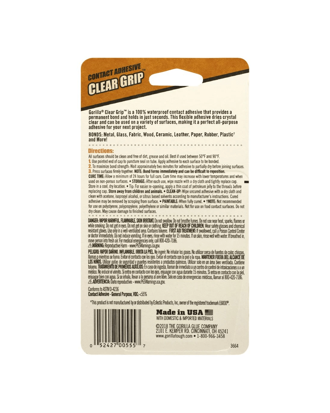 Enjoy the strong stick of this Gorilla Clear Grip Contact Adhesive. It has a fast grab that holds in seconds, and dries crystal clear so it doesn't hinder the appearance of your work, and can still be painted over after. It's suitable for use with metal, glass, fabric, ceramic, and more, so it's perfect for your next project.
