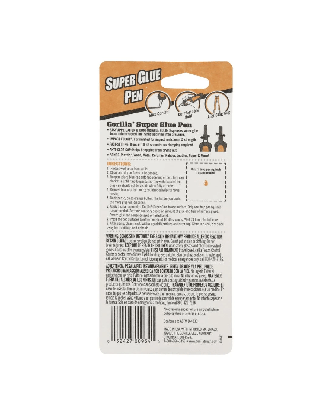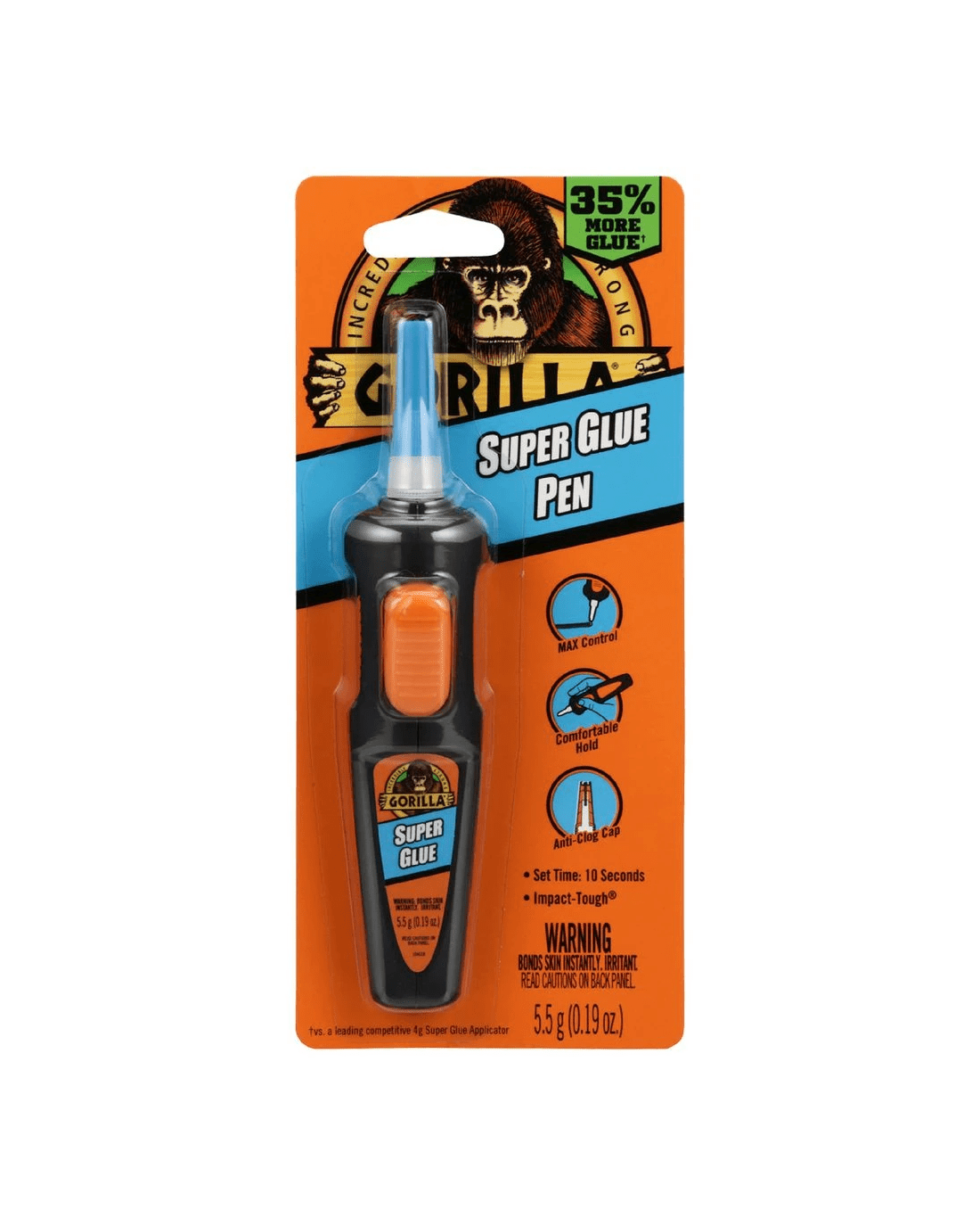 Approach your tasks with this handy Gorilla Super Glue Pen. It dispenses glue in an uninterrupted line, giving you maximum control over its application. This glue is formulated to be resistant to impacts and strengths, fast-setting in 10-45 seconds and being usable across wood, metal, ceramic, and other materials.