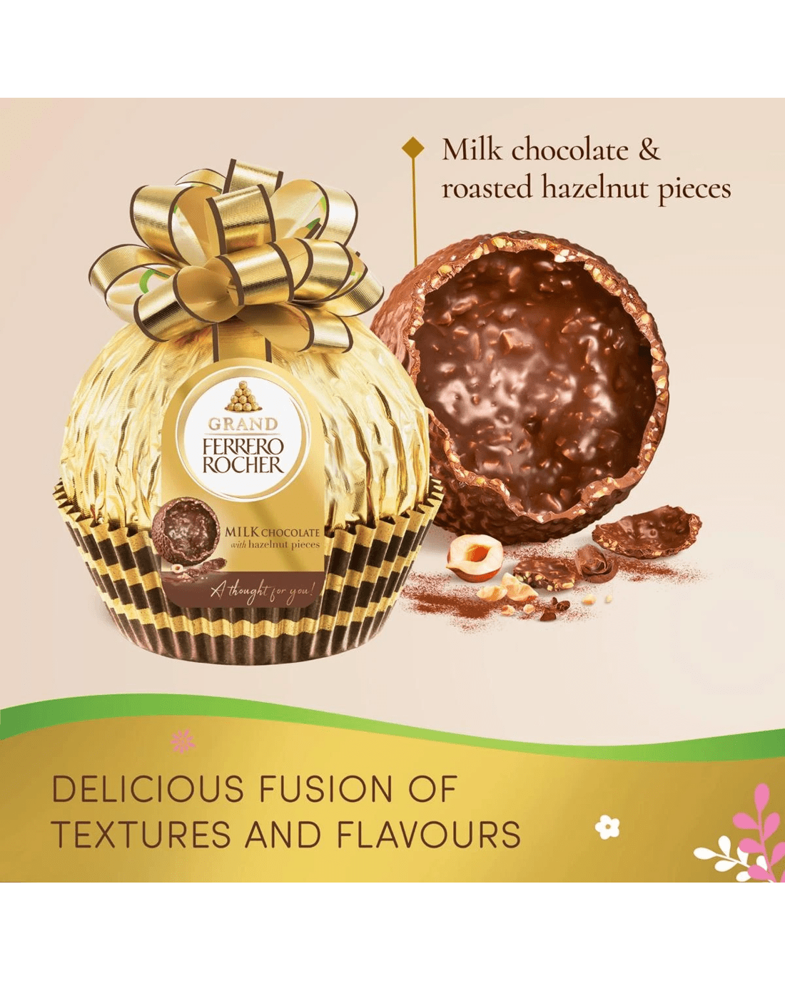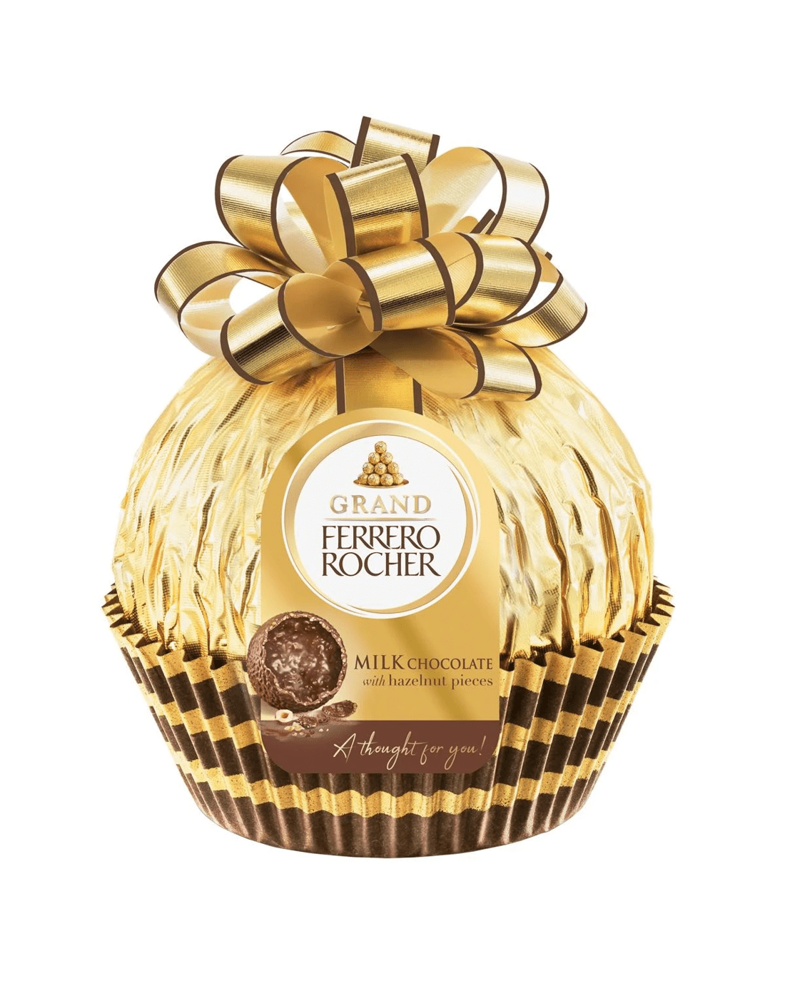 Elevate your Easter festivities & celebrations with this stunning creation. Add your golden touch to Easter gifting this year with the impressive Grand Ferrero Rocher, a rich milk chocolate shell with delectable crunchy hazelnut pieces. The premium chocolate experience is evident in every bite, a testament to the attention to detail that goes into creating this masterpiece. This Easter chocolate is the perfect way to say it with gold this Easter. The festive moments of Easter deserve to be celebrated with something truly special, something that embodies the spirit of joy and togetherness.