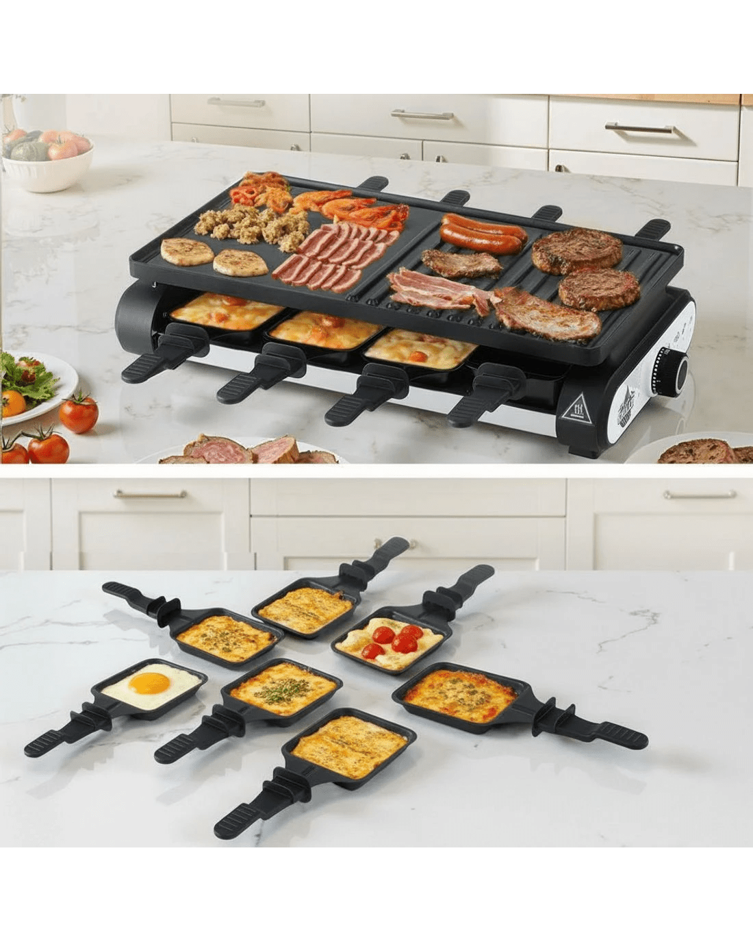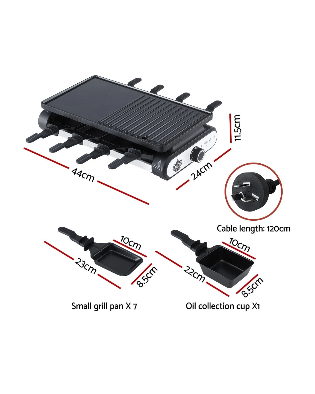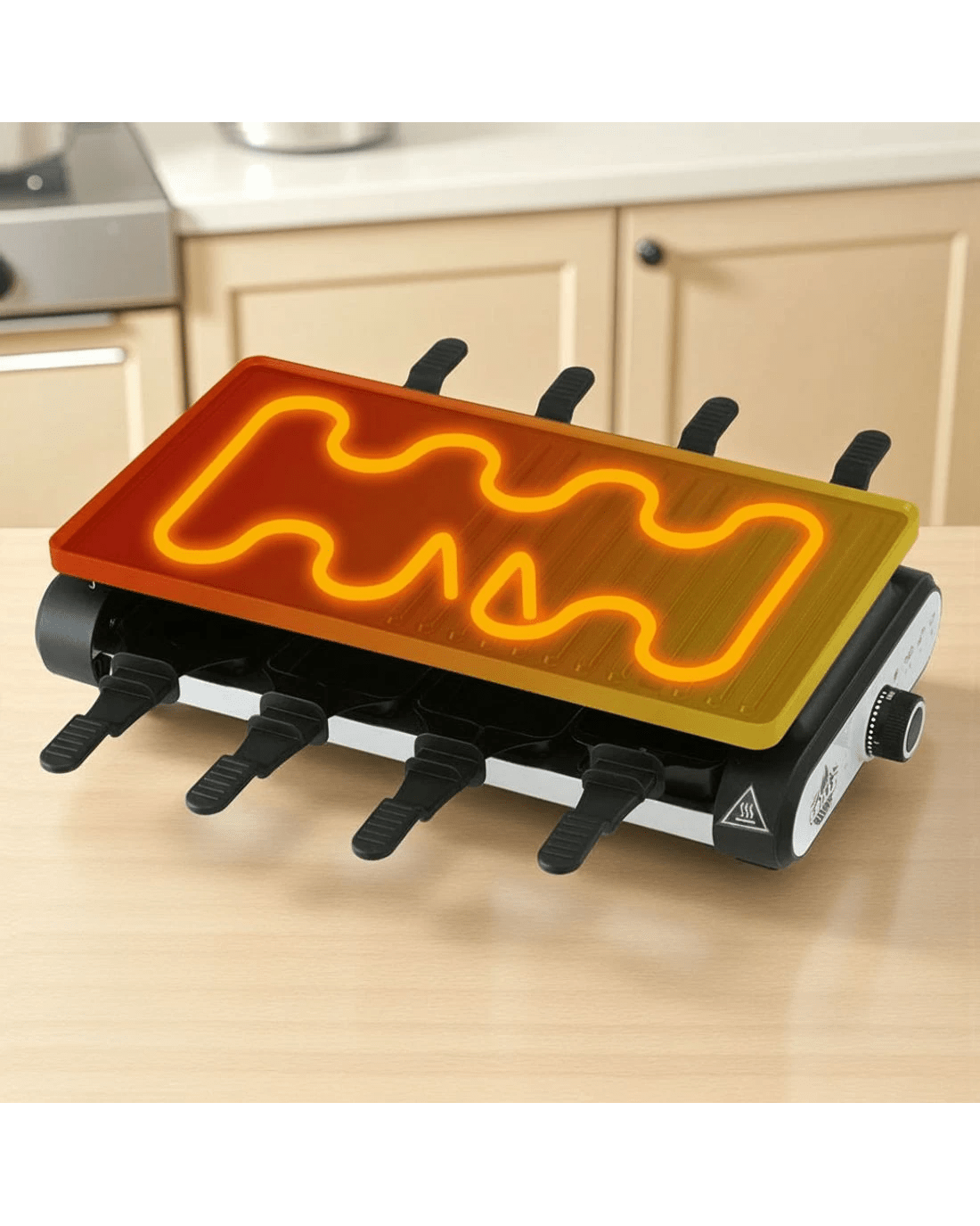 Introducing Grillz high-powered and smokeless BBQ grill, featuring a powerful max 1400W for efficient and quick cooking. The non-stick and removable coating cooking plate ensures easy cleaning. With 7 independent pans, this BBQ grill offers versatility in cooking different foods like cheese, eggs, butter, and more. The dishwasher-safe grill plate, pan, and oil collection tray further enhance convenience by allowing for easy and thorough cleaning. The adjustable temperature controller with 5 heat levels allows for precise control over cooking temperatures to ensure perfectly cooked meals every time. Additionally, this grill heats up in just 5-8 minutes, making it ideal for both indoor and outdoor use. Upgrade your cooking experience with our electric BBQ grill and enjoy delicious meals with ease, whether indoors or outdoors.