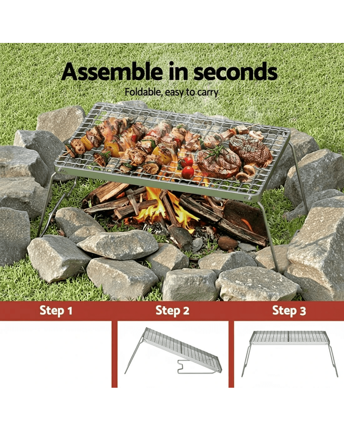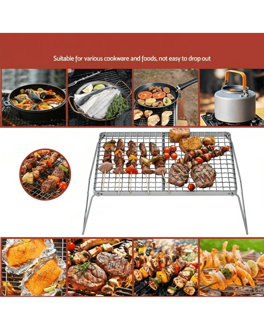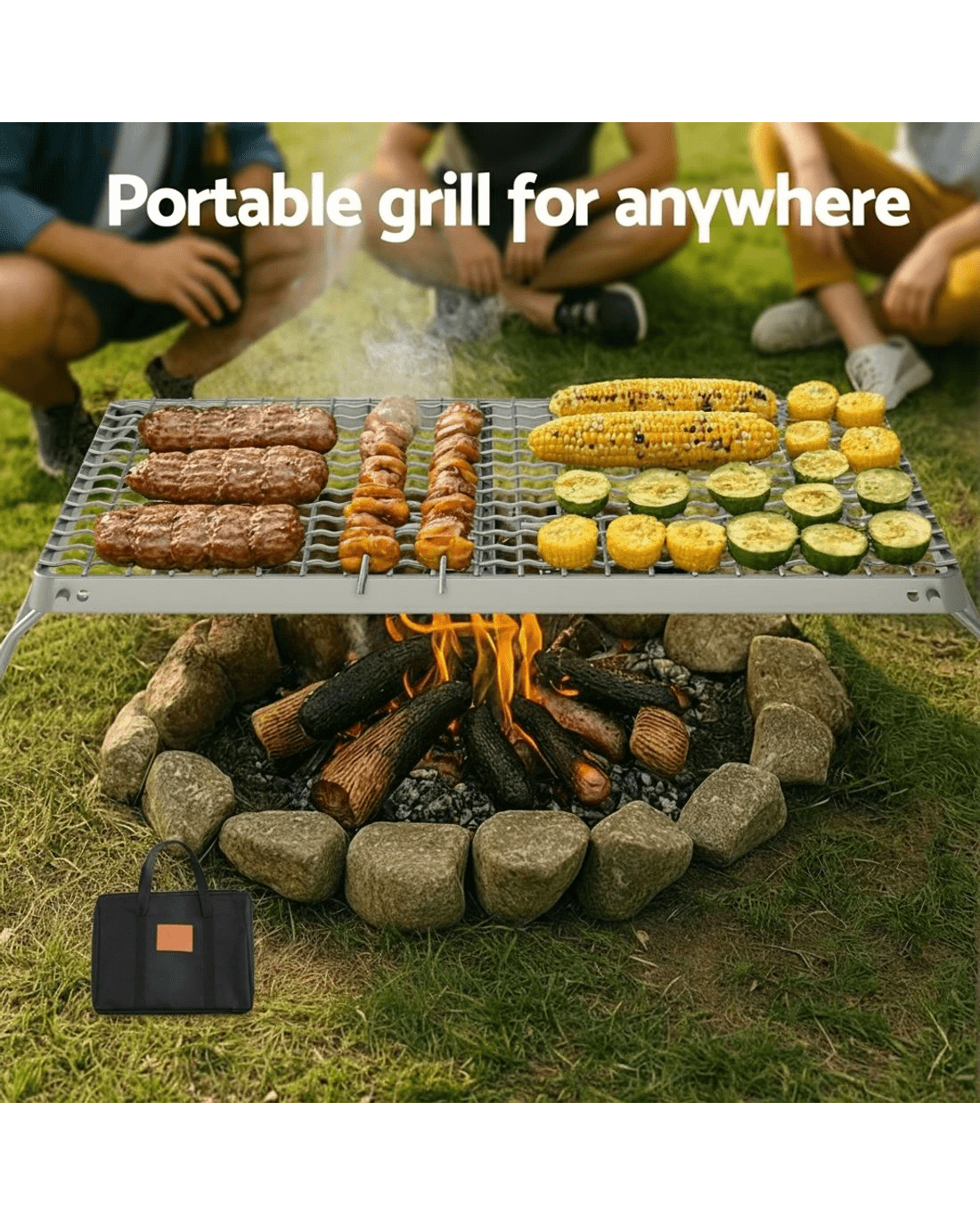 The Grillz Portable BBQ Grill combines professional-grade performance with ultimate mobility. Featuring military-grade steel construction and premium stainless steel cooking grates, this durable outdoor cooker withstands high-temperature cooking while resisting warping. Its innovative folding legs allow compact storage in the included carry bag, making it ideal for camping trips, beach outings, and backyard gatherings. The multi-layer mesh design is suitable for various cookware and foods, preventing bbq foods from falling through. Compatible with both charcoal and wood fuels, the non-slip leg locks provide stable cooking on any terrain. Enjoy your party!