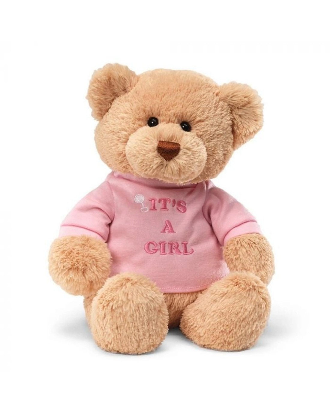 - Tan plush teddy bear featuring removable pink t-shirt with 'It's A Girl' embroidered message