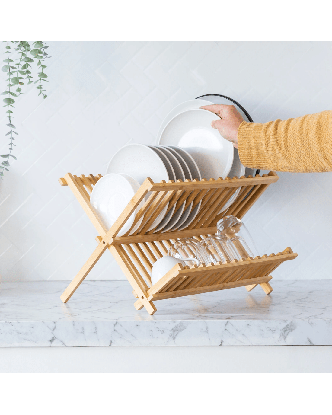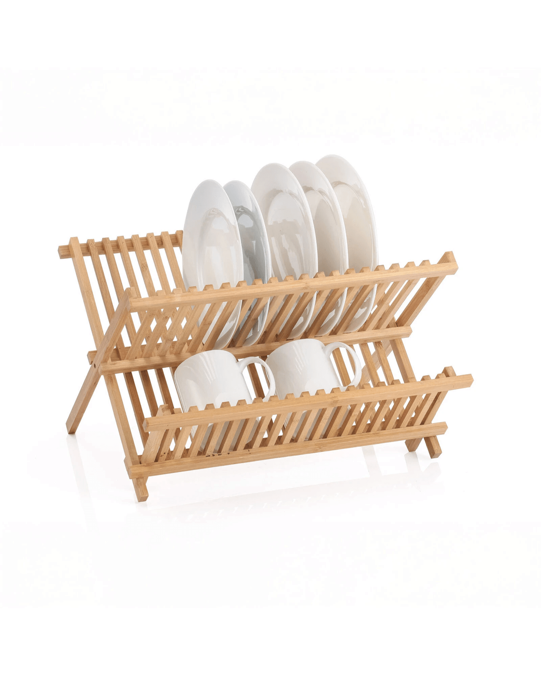 Keep your kitchen neat with this foldable bamboo dish rack. Its sturdy X-shape design holds plates, bowls, and cups securely, while the natural bamboo adds a stylish touch. Lightweight and space-saving, it folds flat for easy storage when not in use.