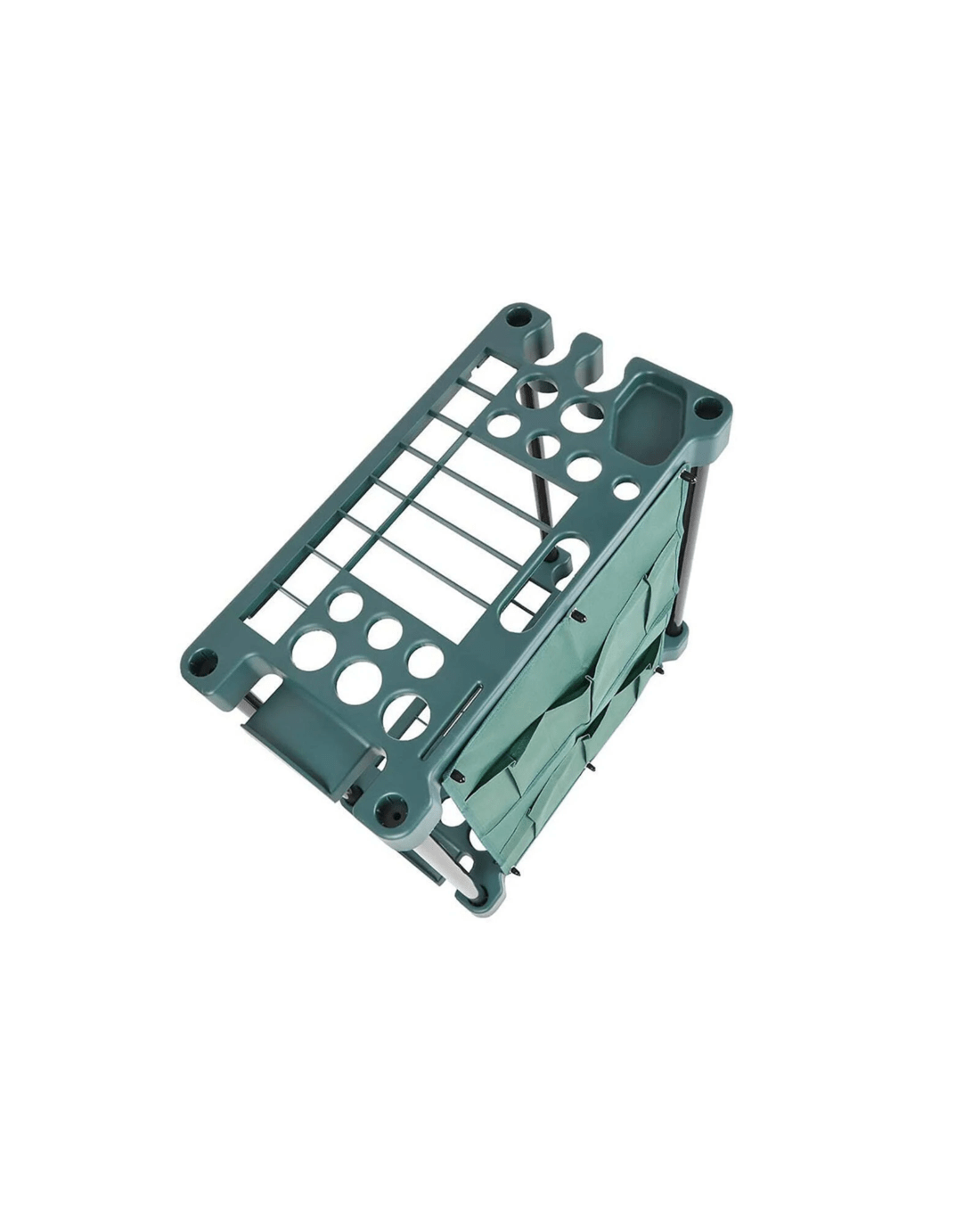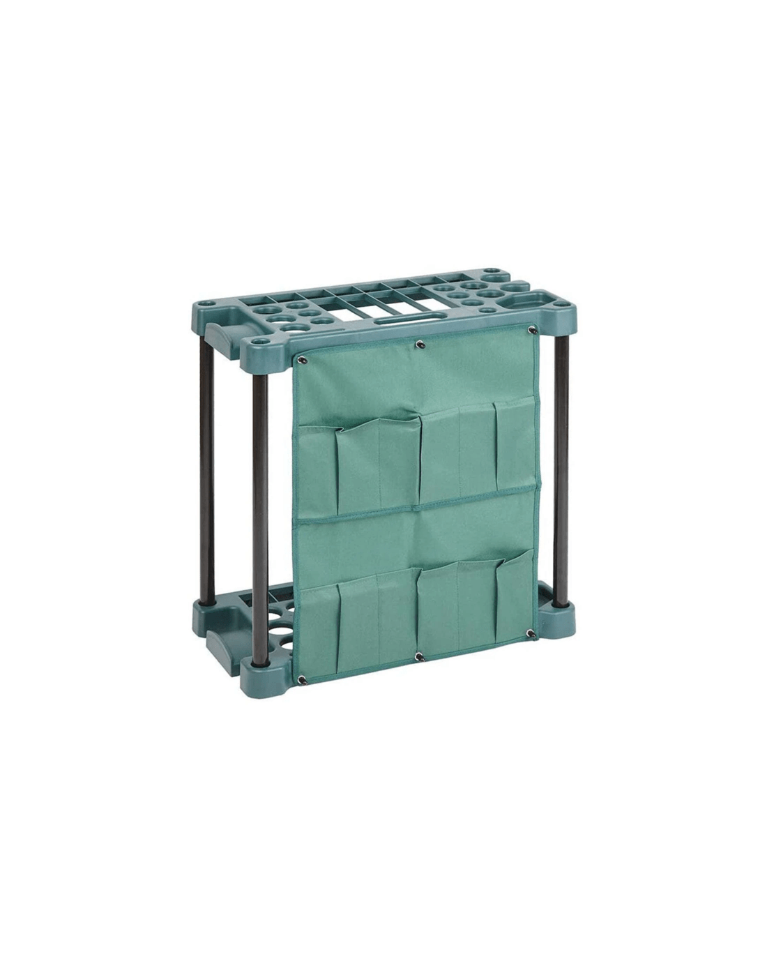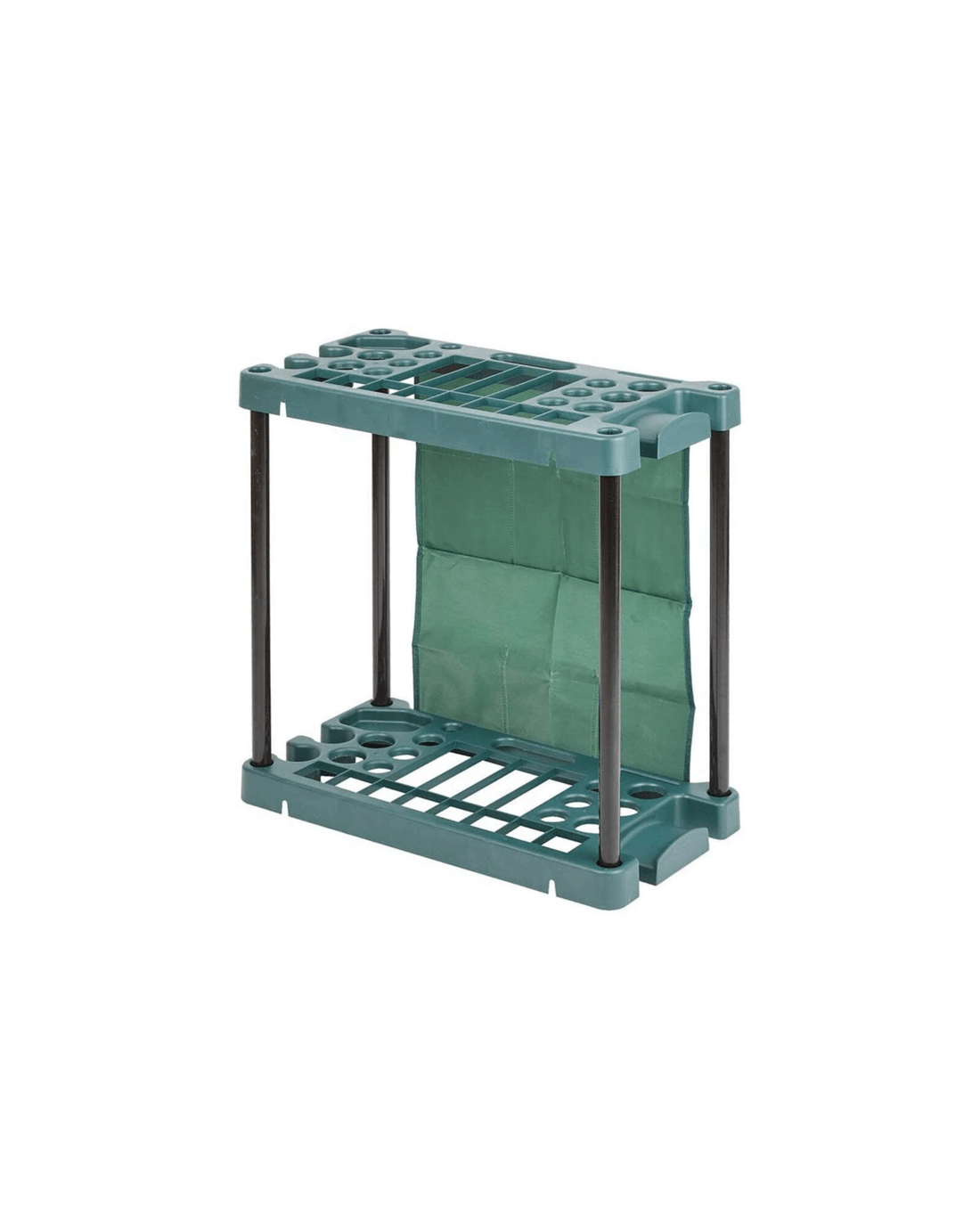 - Garden Tools Storage Rack, holds long and short-handled tools as well as small accessories compartment, attachable additional compartment pouch included, 40 tool slots, durable plastic construction to help resist against rusting, rotting, chipping and peeling, sturdy iron pipes, top-loading tool slots, bottom grooves keep tools stored in place, minimal assembly without any assembly tools required, suitable for indoor and outdoor use