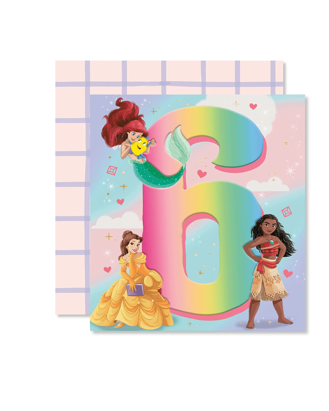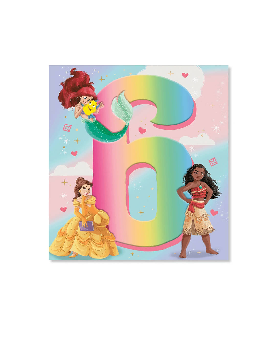 • The front of the card features gold foil highlights, neon pink ink, embossed elements, illustrations of Disney's Moana, Ariel from The Little Mermaid, Belle from Beauty and the Beast, twinkling stars and gems and the message '6'