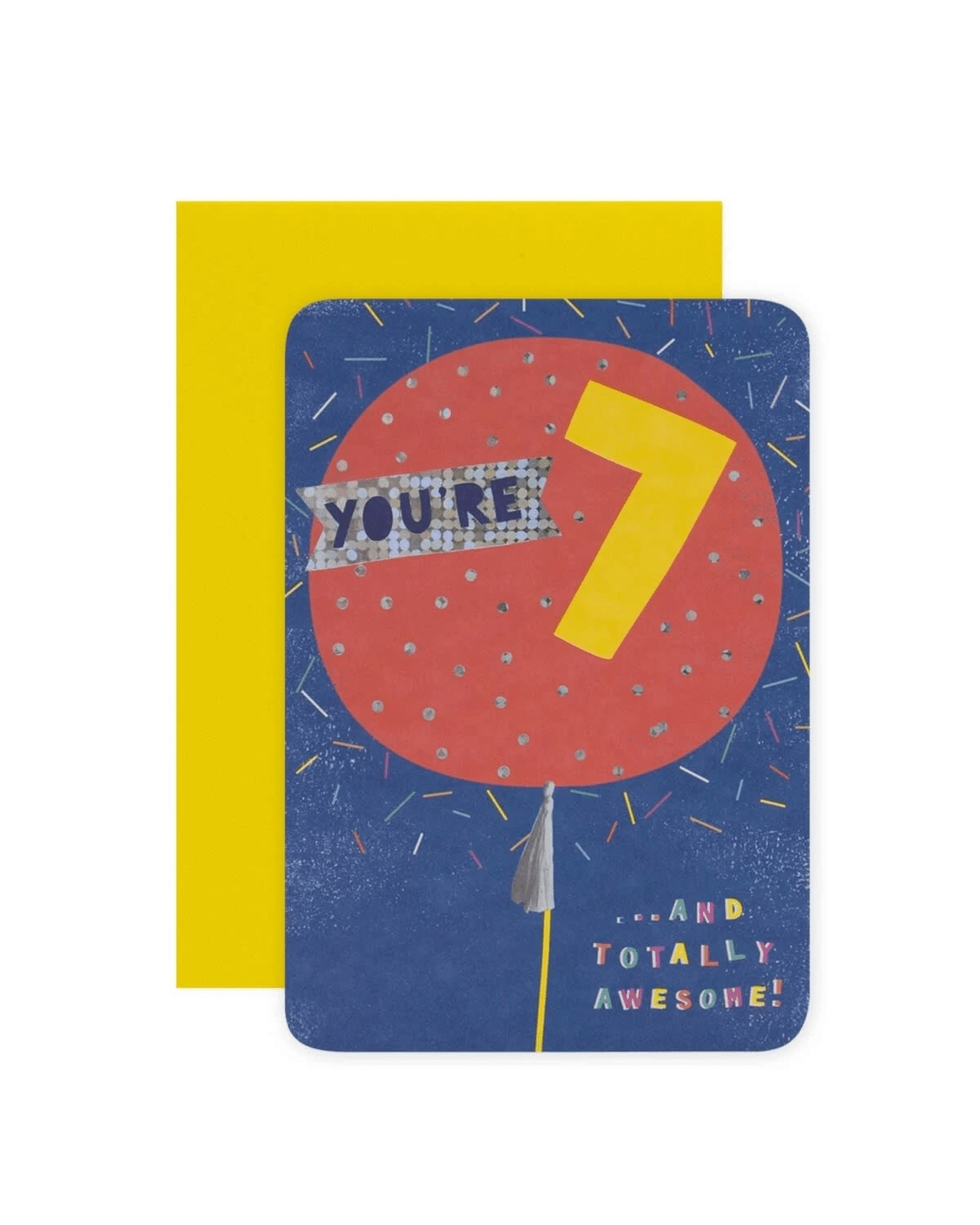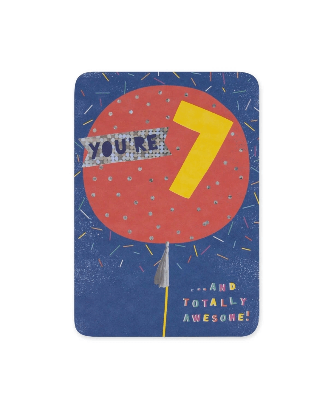 • The front of the card features a fun illustration of a big birthday balloon surrounded by colourful confetti, holographic highlights and the message 'YOU’RE 7 … AND TOTALLY AWESOME!'