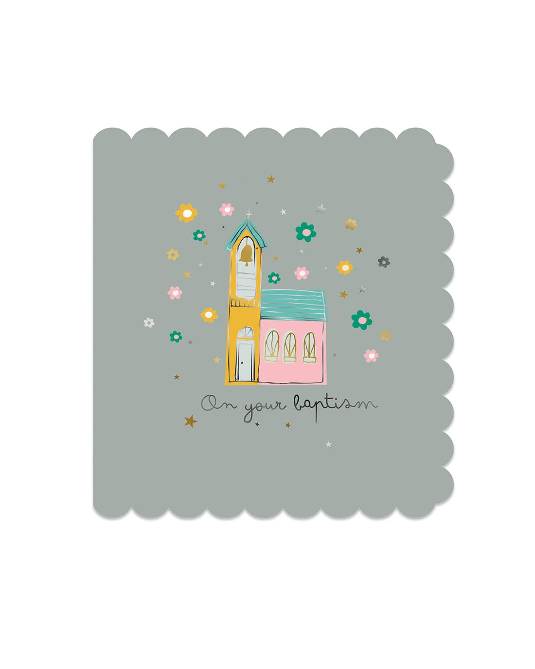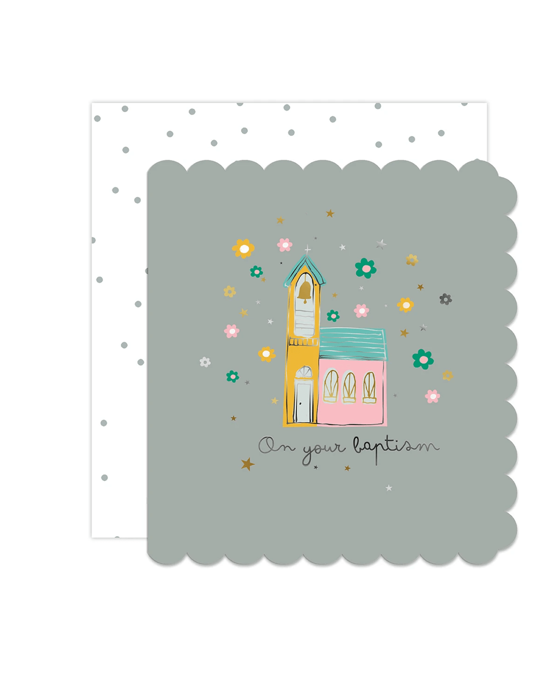 • The front of the card features gold foil highlights, scalloped borders, an adorable illustration of a church surrounded by flowers and stars and the message 'On your baptism'