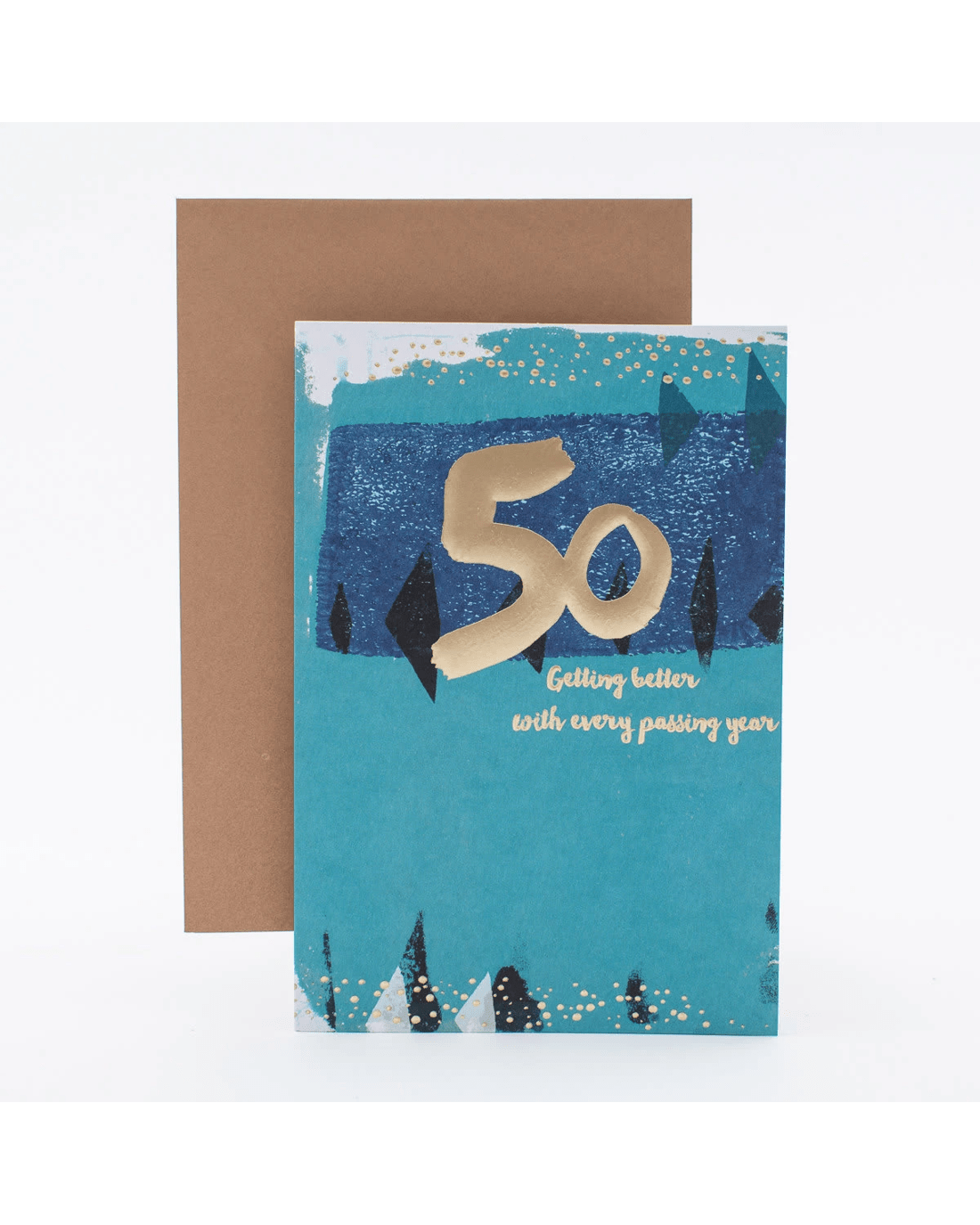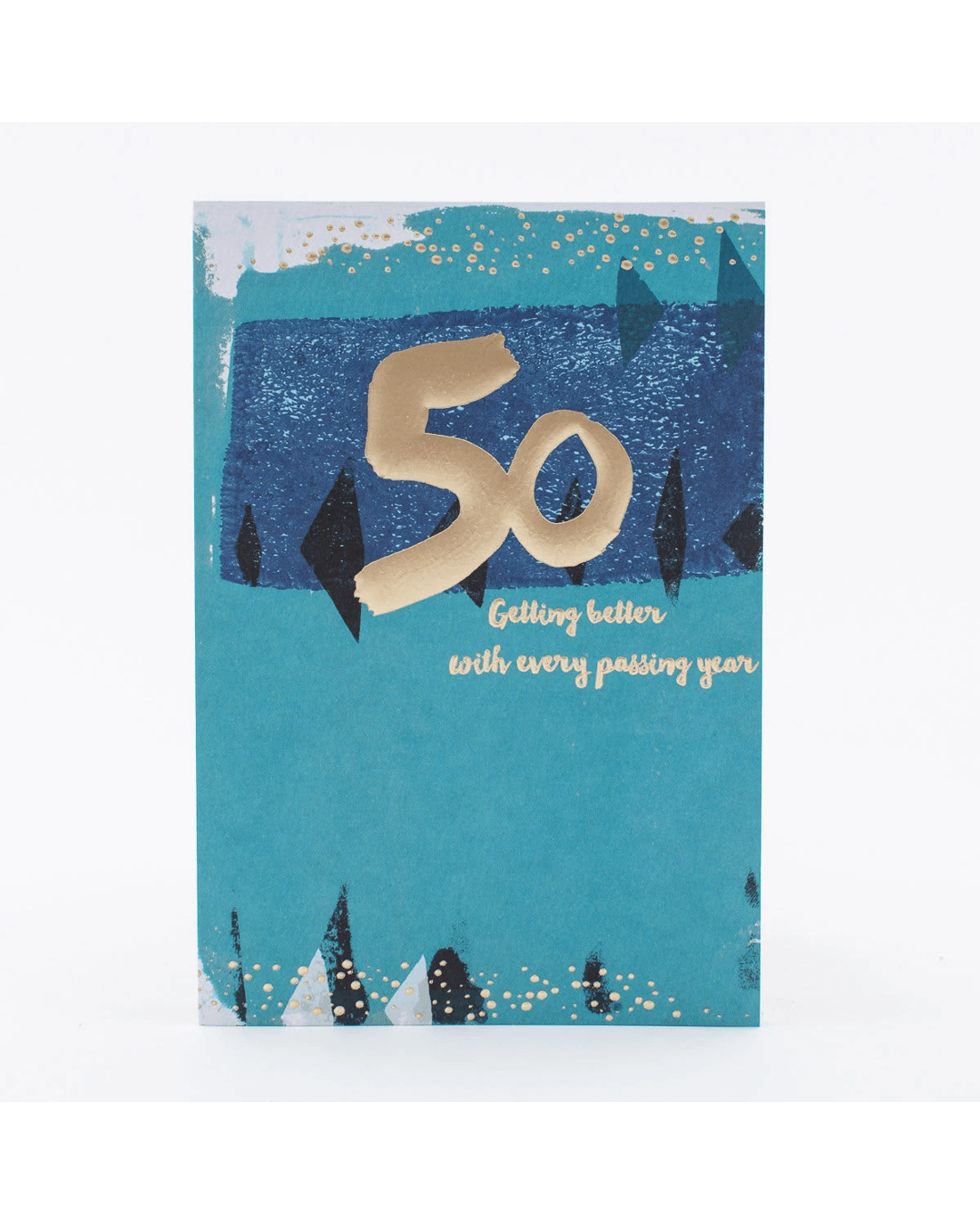 • The front of the card is textured and features gold highlights, debossed detailing and contemporary illustrations of fun shapes with the message: '50 Getting better with every passing year'