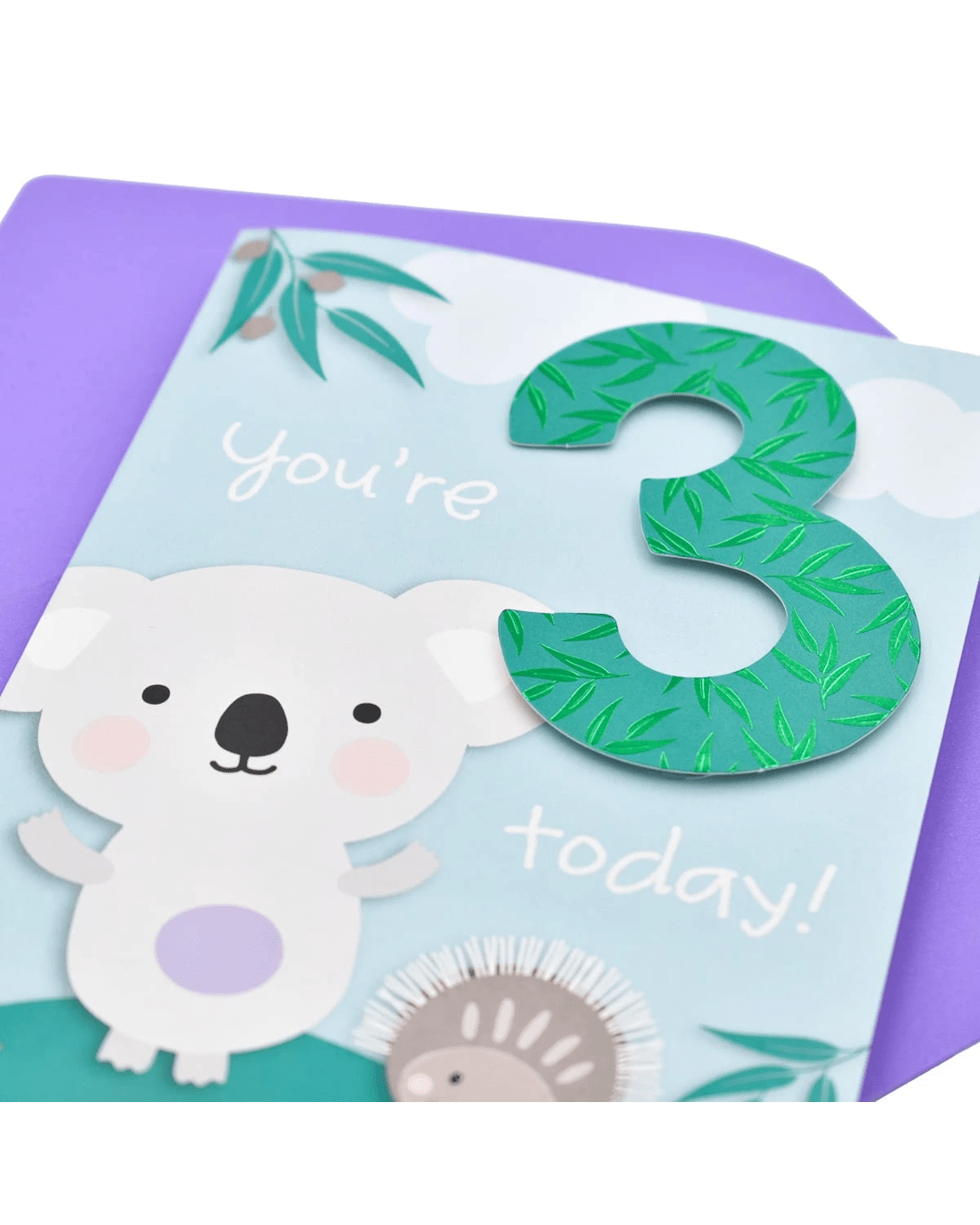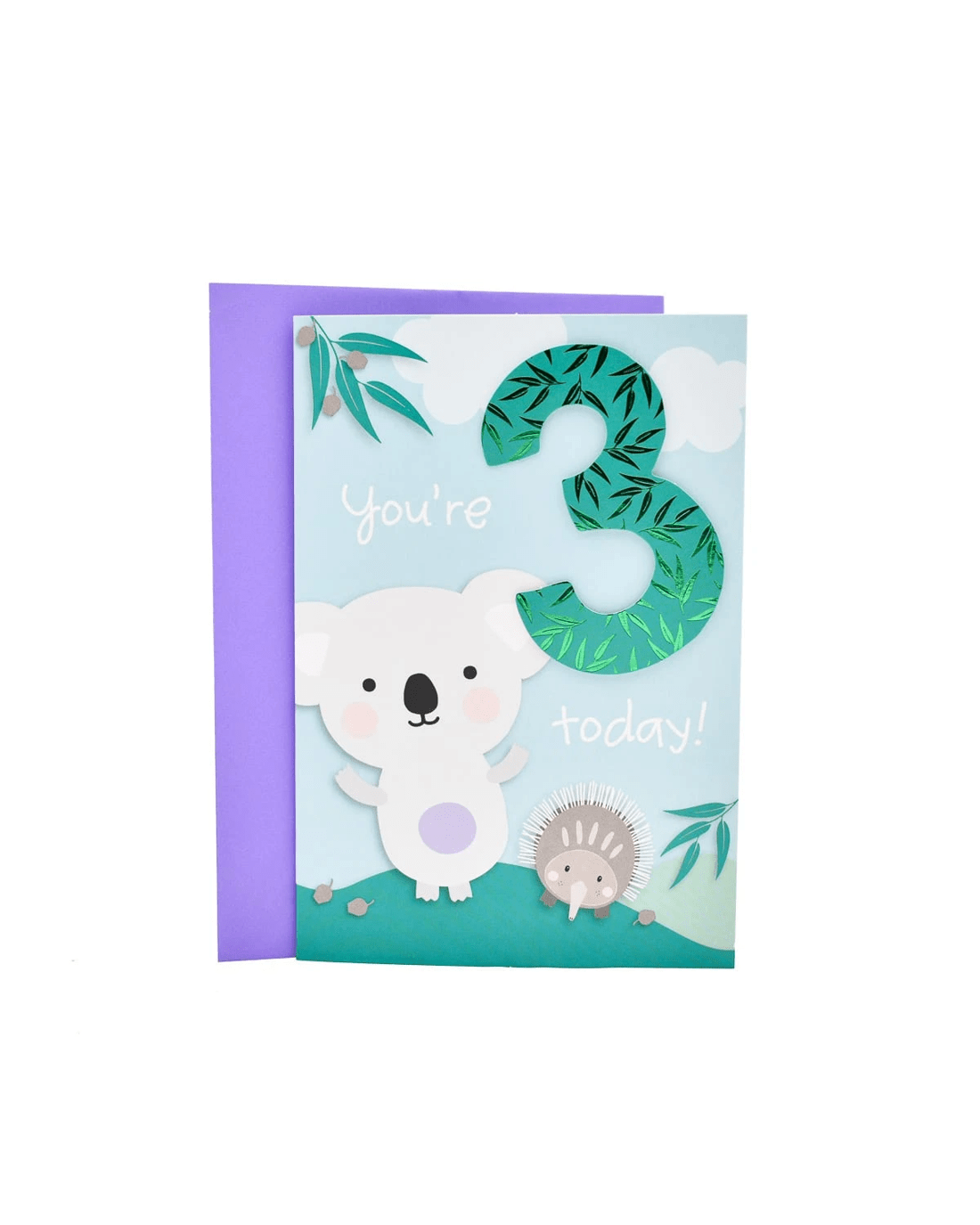 Wish your little one a happy 3rd birthday, with a cute koala, echidna and a gum-leaf patterned pop-out card from Hallmark.