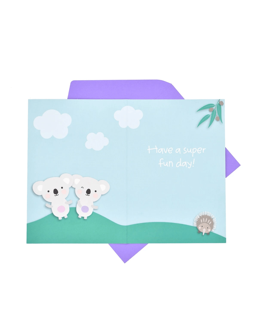• The message on the cover reads 'You're 3 today!'. The outdoorsy theme continues inside the card, where you can find two more cute koalas and another echidna!