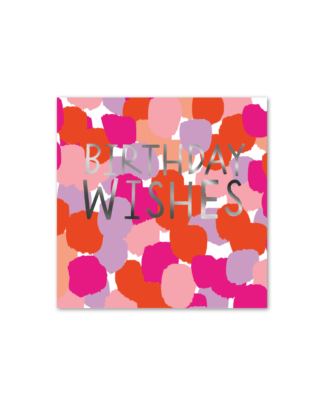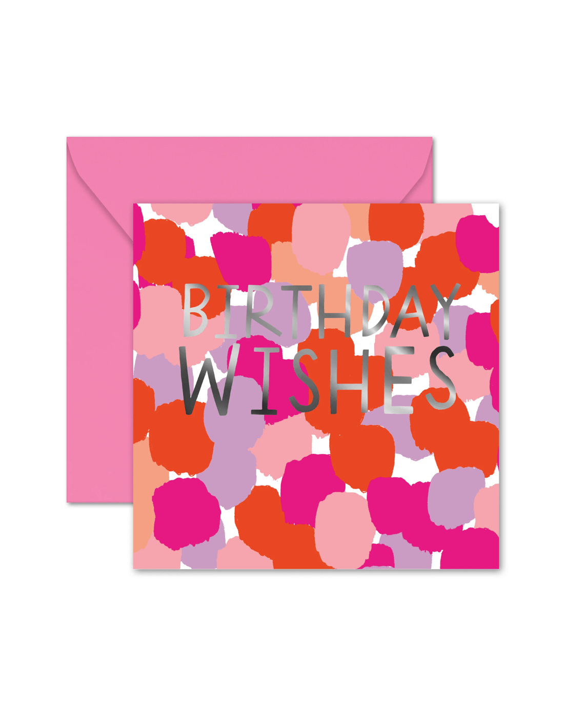 • The front of the card features silver foil highlights, illustrations of colourful confetti and the message, 'Birthday Wishes'