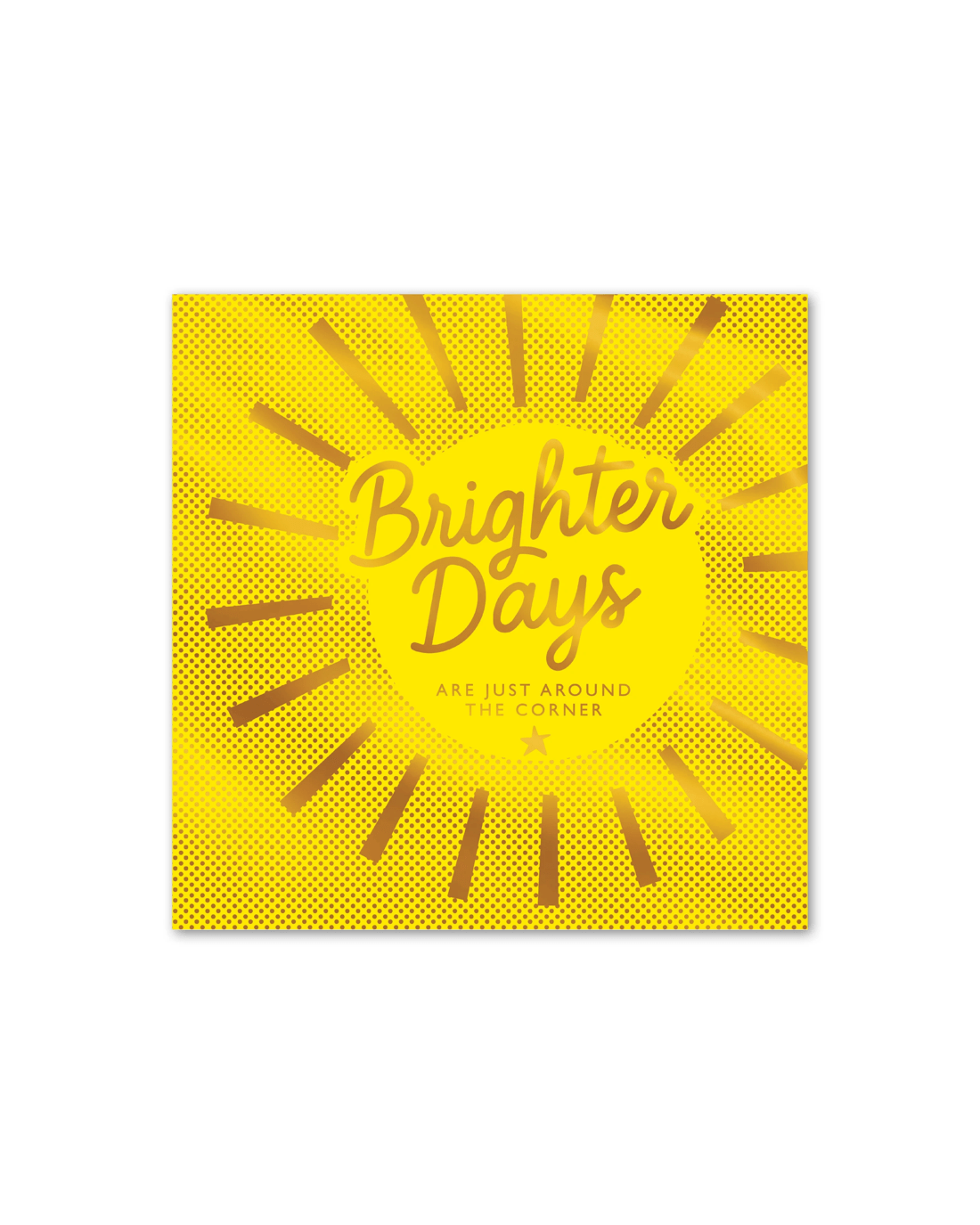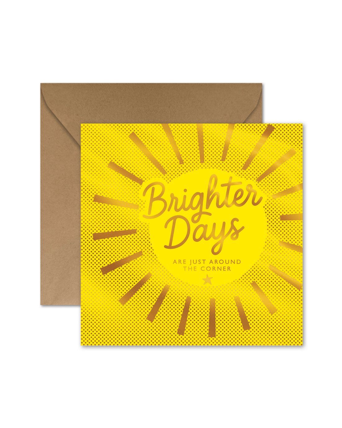 • The front of the card features gold foil highlights, an illustration of a shining sun, and the message 'Brighter Days ARE JUST AROUND THE CORNER'