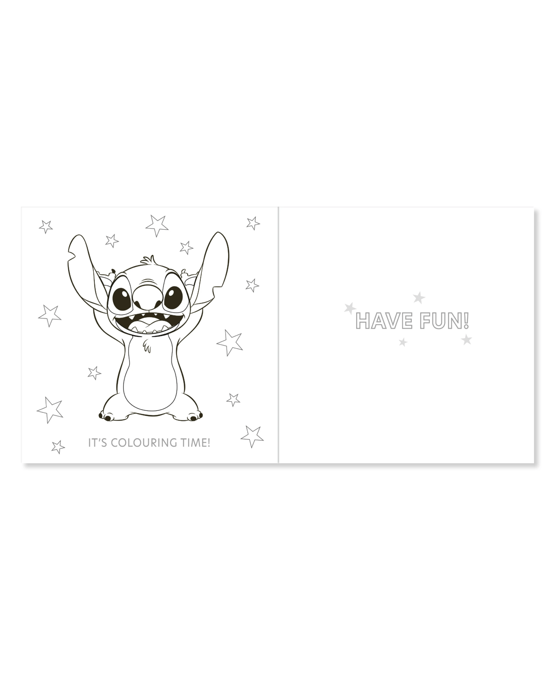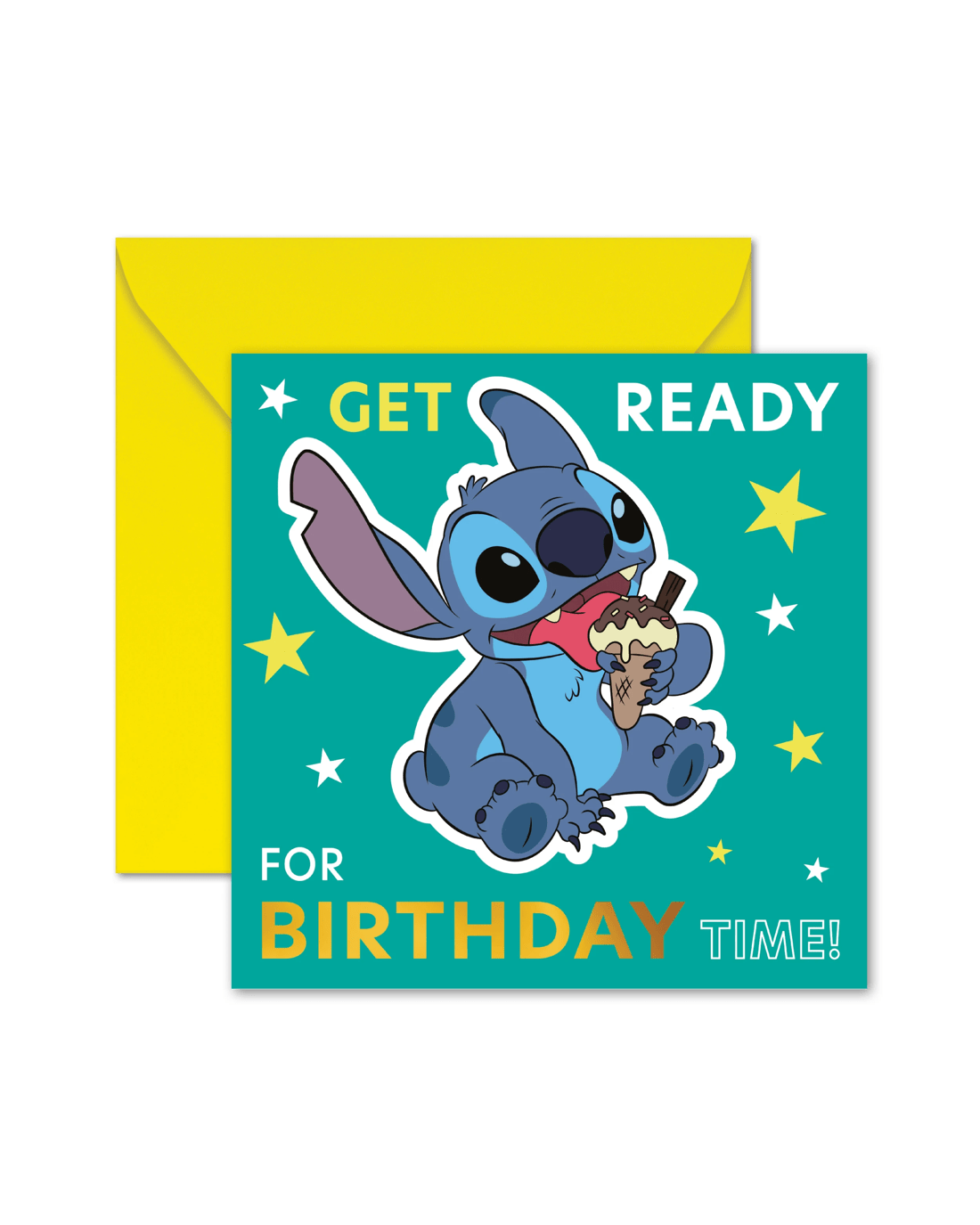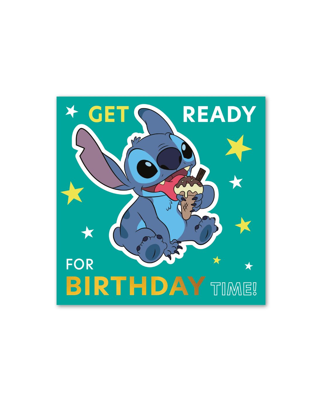 • The front of the card features foil highlights, an illustration of Stitch eating an icecream cone from Disney's Lilo and Stitch, and the message 'GET READY FOR BIRTHDAY TIME'