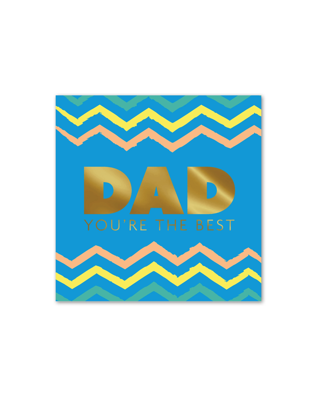 • The front of the card features gold foil highlights, neon ink, illustrations of zig zag patterns, and the message 'DAD YOU'RE THE BEST'