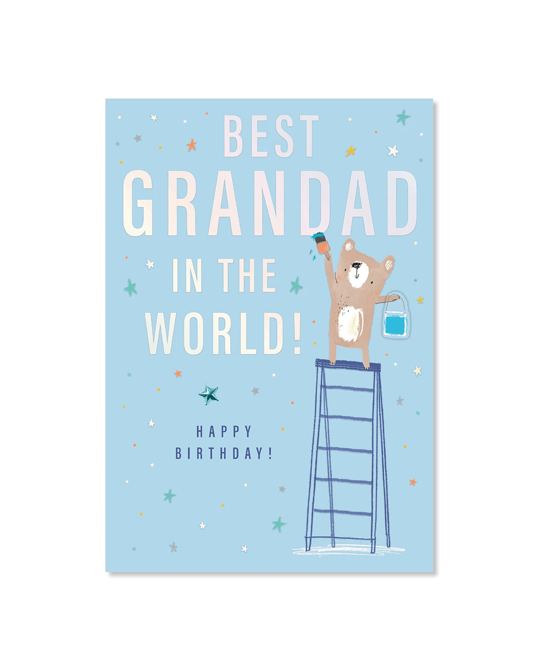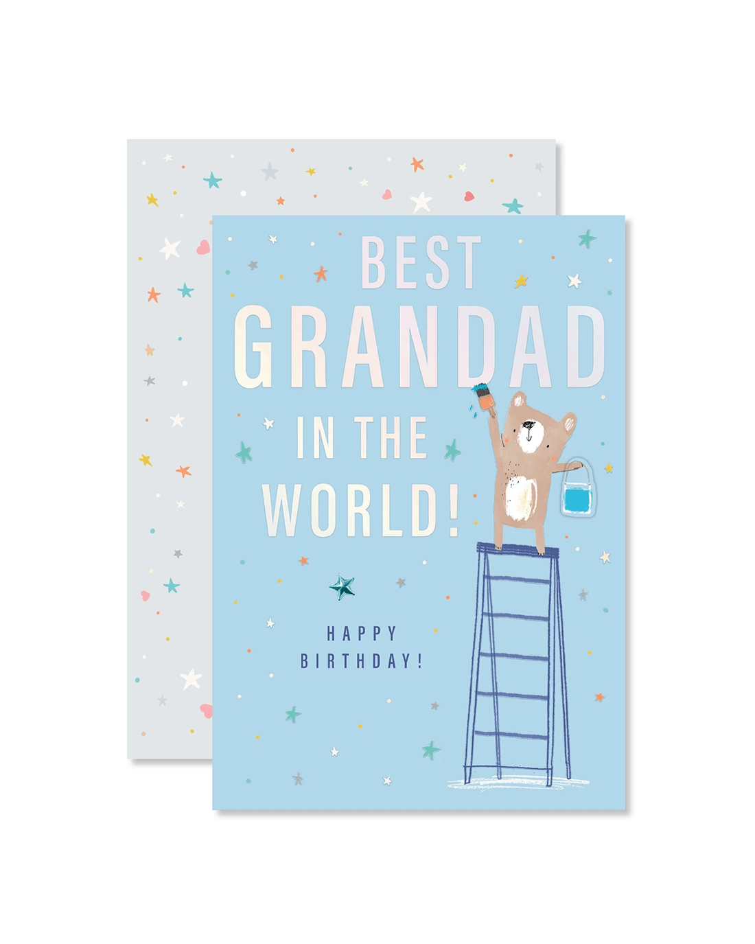 • The front of the card features silver holographic highlights, a blue foil paper star gem, embossed elements, a plaque attachment, an adorable illustration of a bear standing on a ladder painting and the message 'BEST GRANDAD IN THE WORLD! HAPPY BIRTHDAY!'