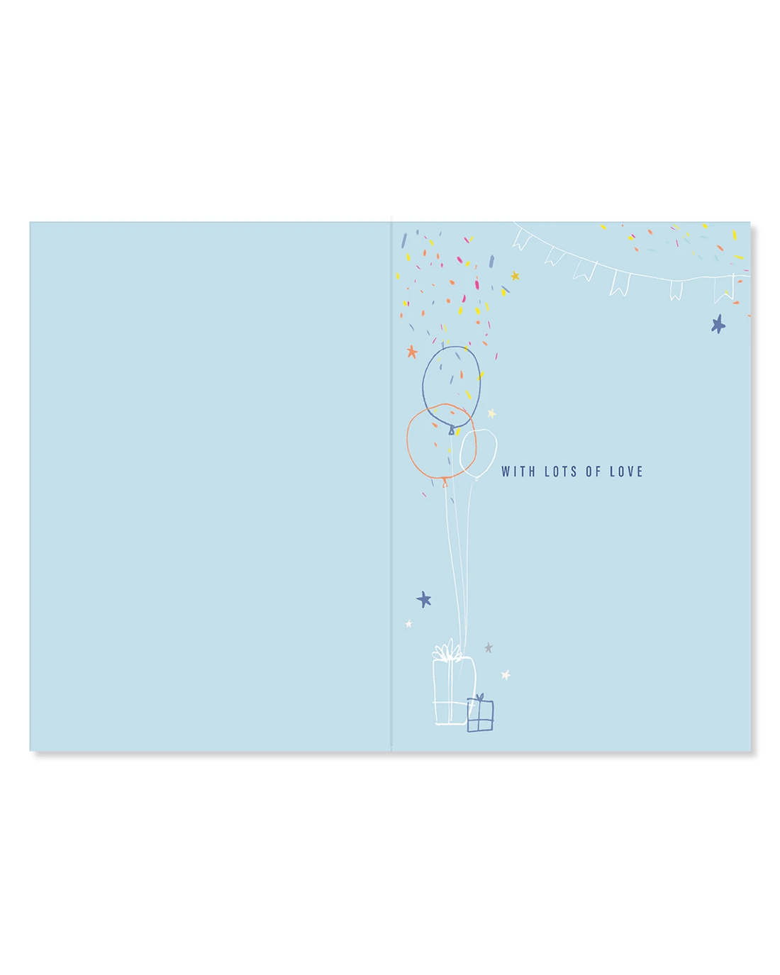 • The inside of the card features illustrations of birthday gifts, balloons and confetti alongside the message 'WITH LOTS OF LOVE'
