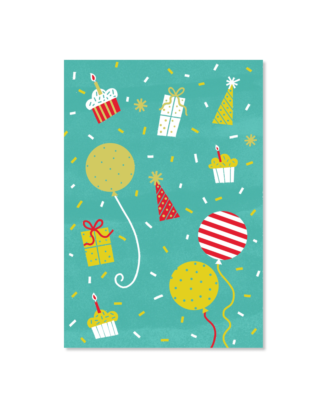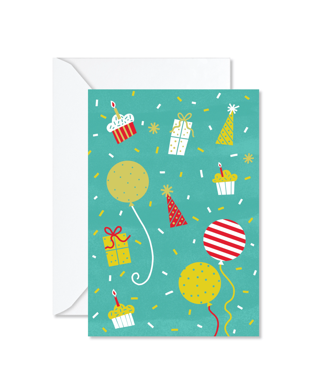 • The front of the card features illustrations of gifts, party hats and confetti