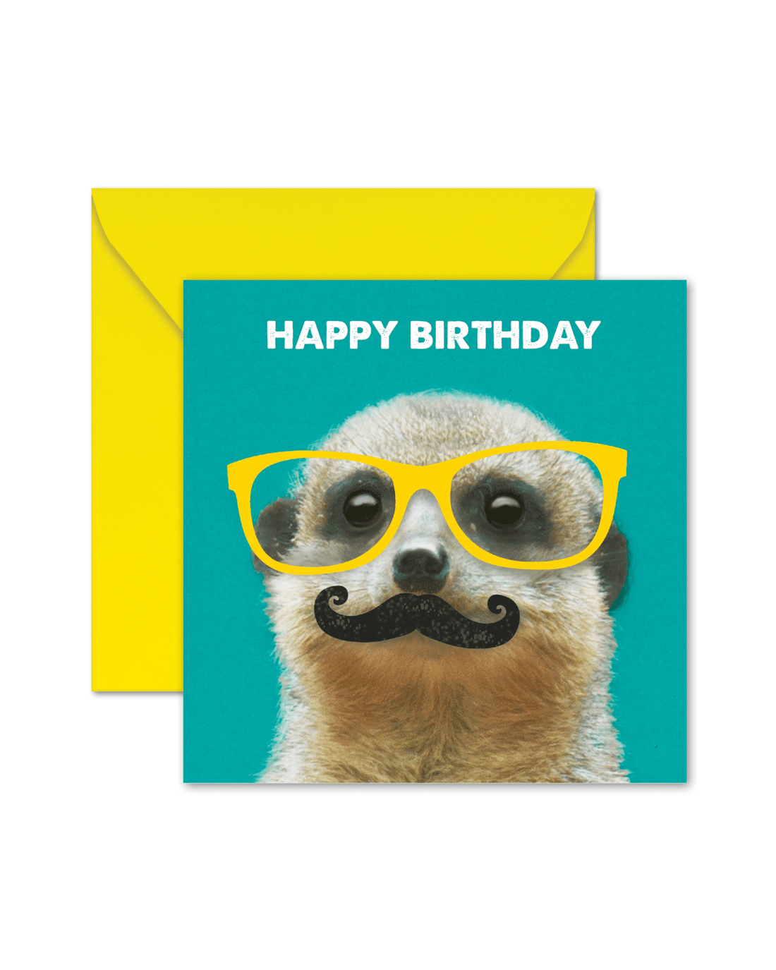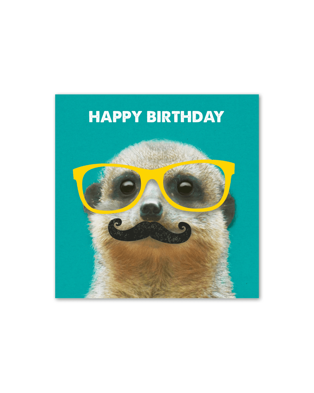 • The front of the card features embossed elements, a photograph of a meerkat wearing illustrated glasses and a moustache and the message 'HAPPY BIRTHDAY'