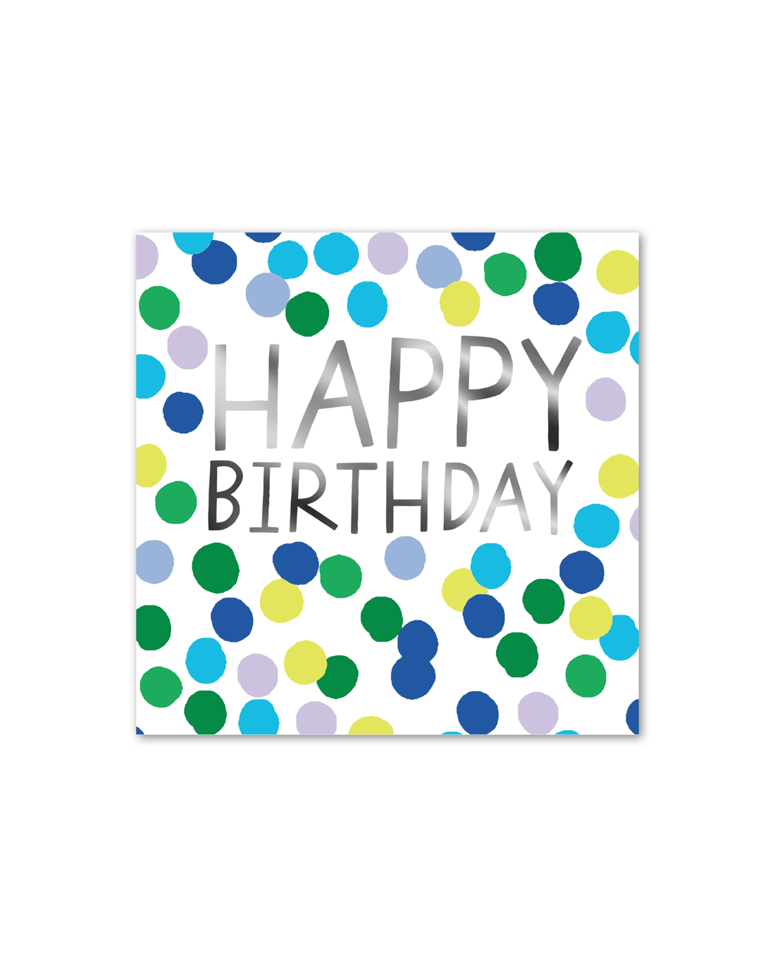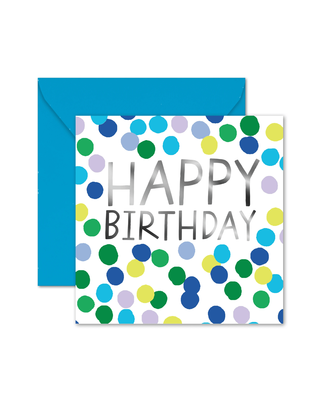 • The front of the card features silver foil highlights, illustrations of colourful confetti and the message, 'Happy Birthday'
