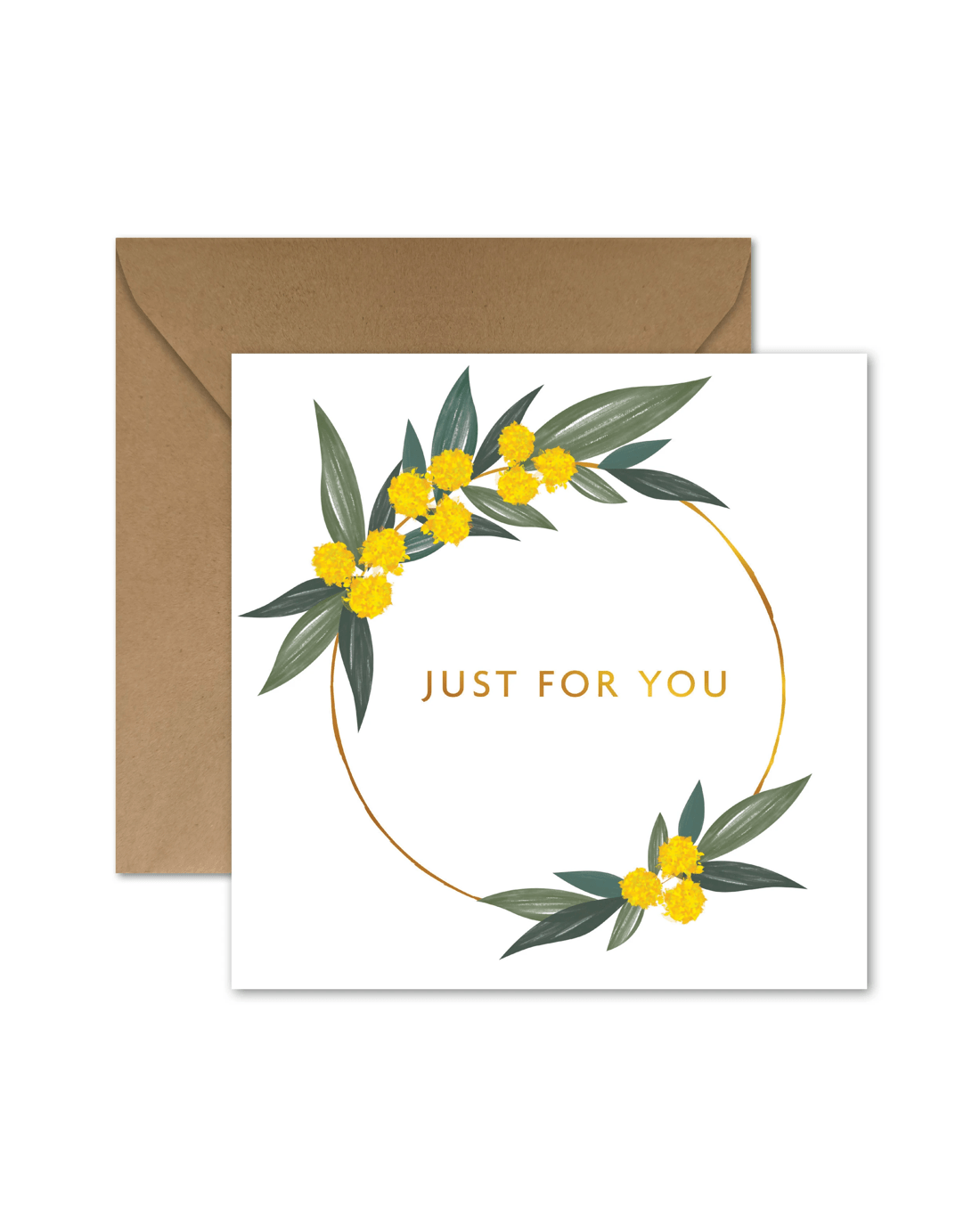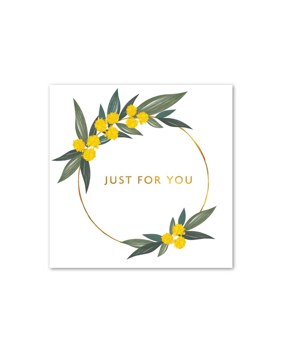 • The front of the card features gold foil highlights, an illustration of a golden wreath with flowering golden wattle accents and the message, 'Just for you'