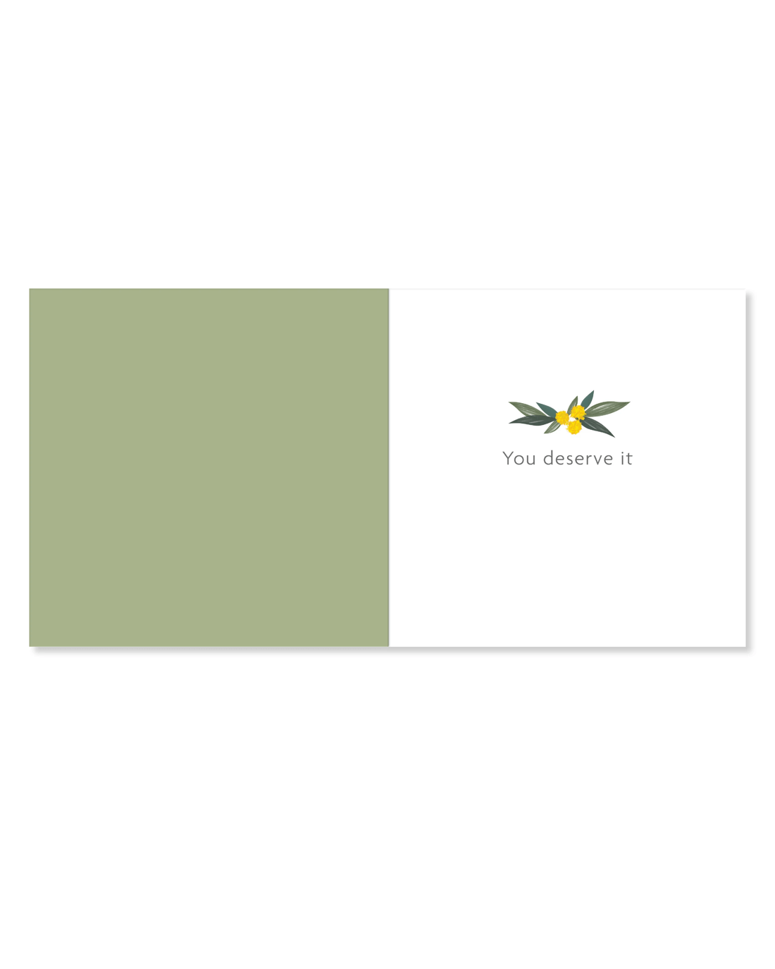 • The inside of the card features an illustration of flowering golden wattle alongside the message, 'You deserve it'
