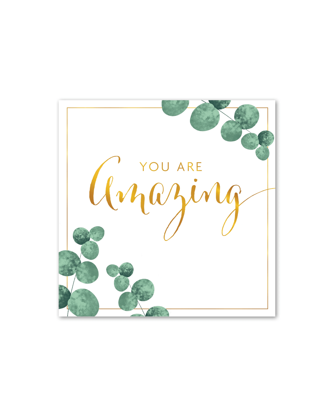 • The front of the card features gold foil highlights, illustrations of a eucalyptus foliage and the message, 'You are amazing'