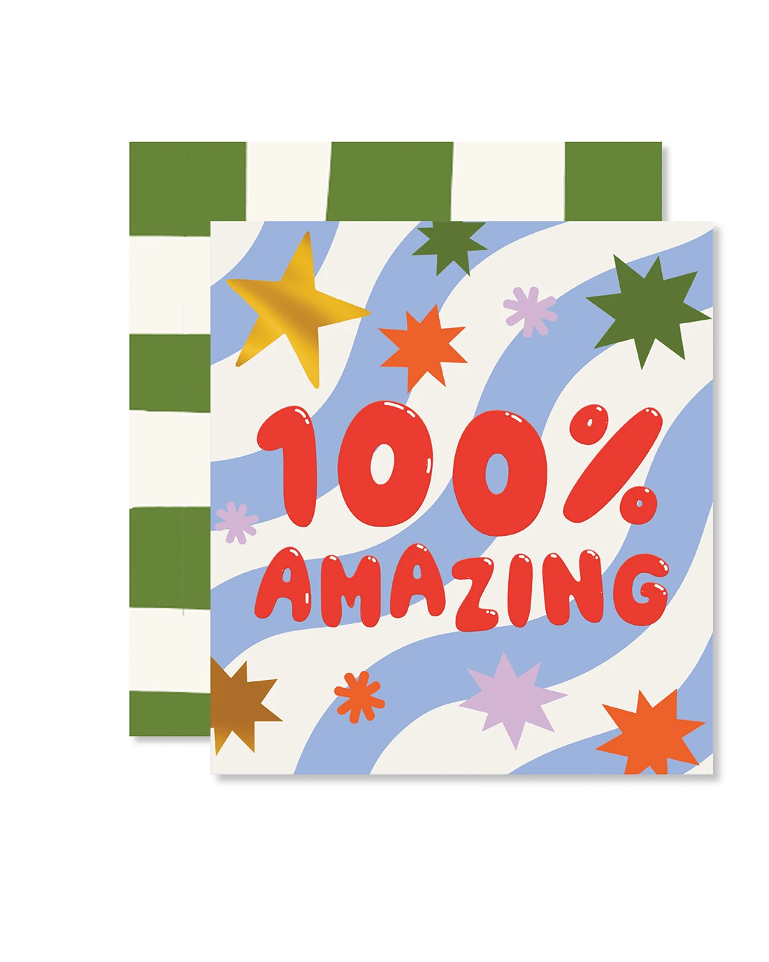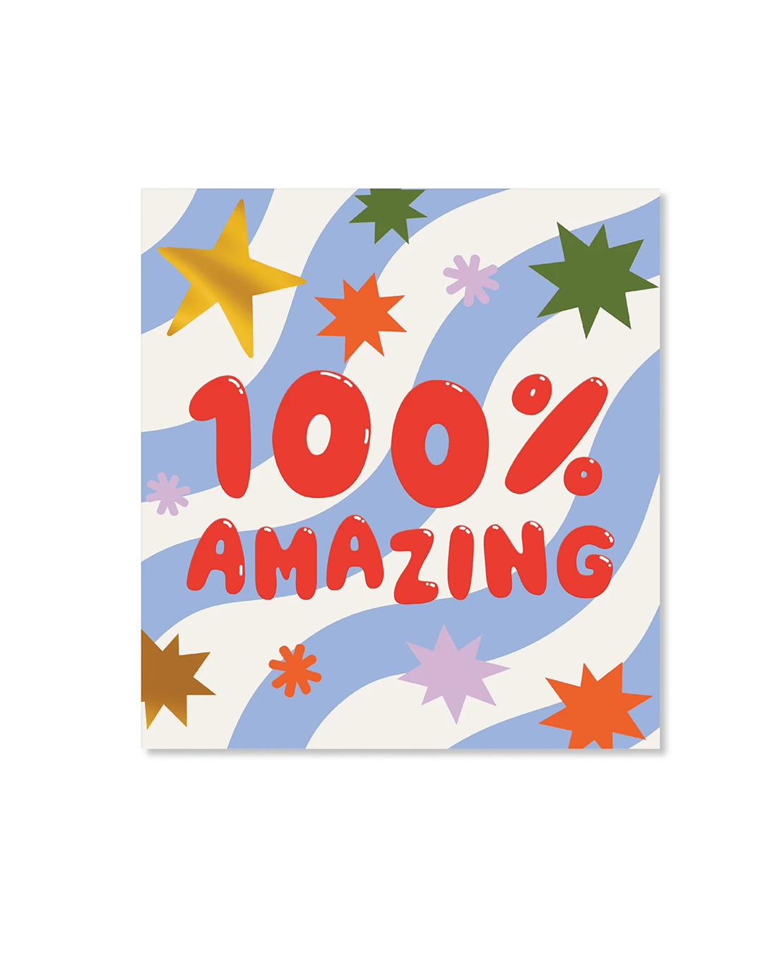 • The front of the card features gold foil highlights, embossed elements, red glossy bubble lettering, illustrations of stars on a blue and white wavy background and the message '100% AMAZING'