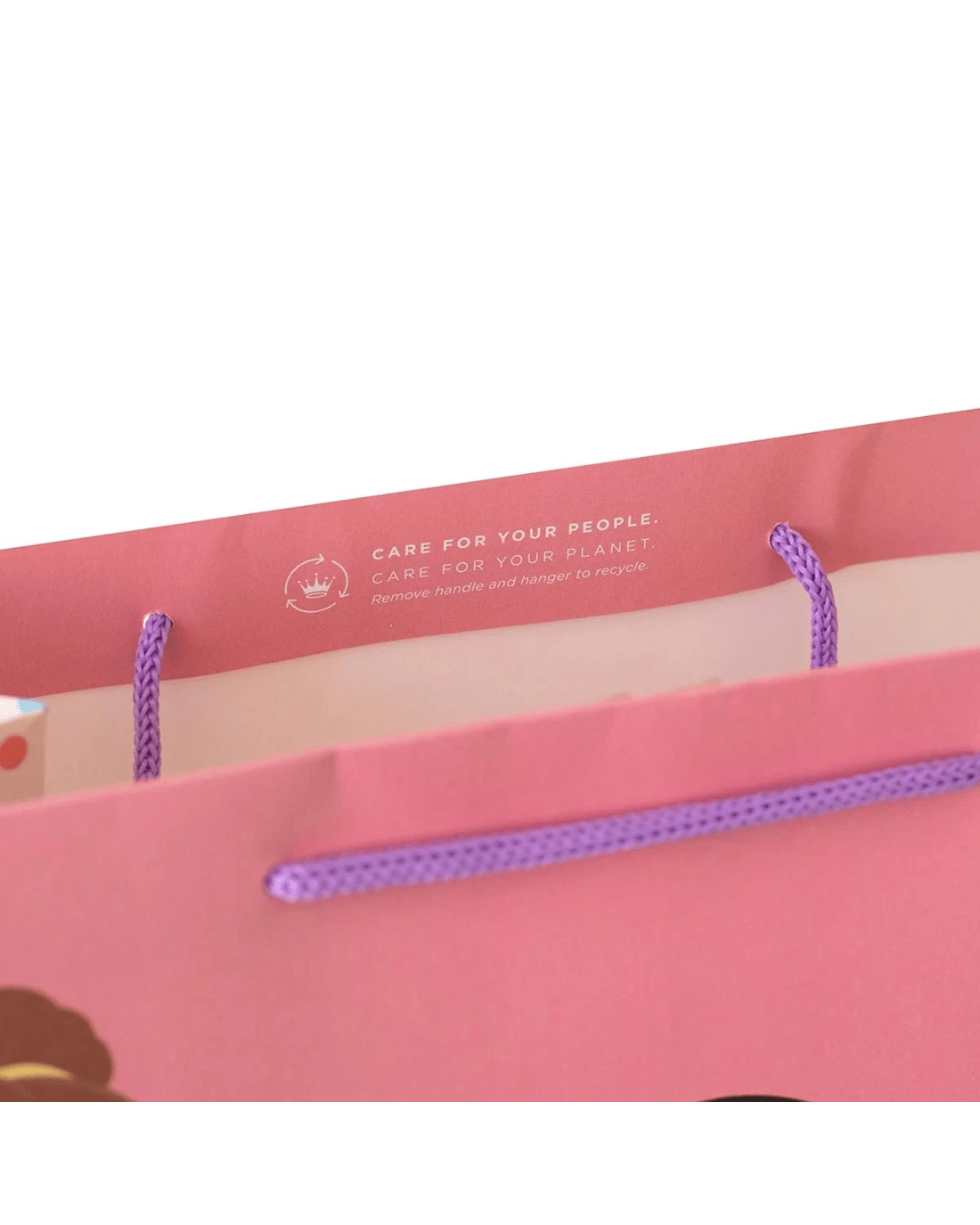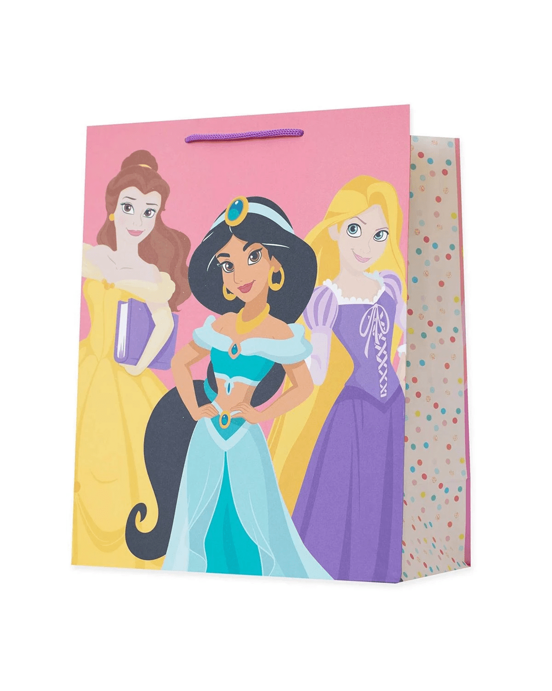 The gift bag features an illustration of Disney Princesses with a pink backdrop and polka dot side gussets with a purple carry handle.