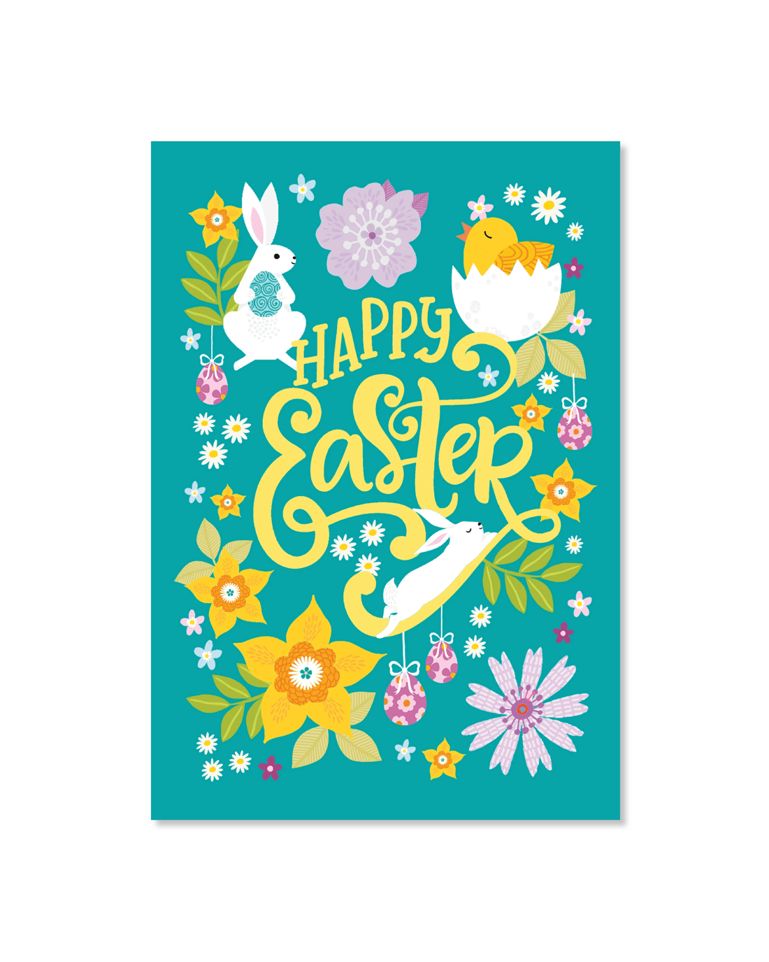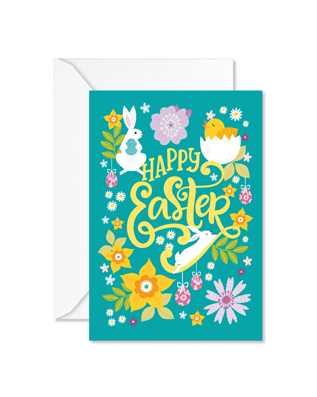 • The front of the card features colourful illustrations of bunny rabbits and a hatching chick amongst a garden of colourful flowers and easter eggs and the message 'Happy Easter''