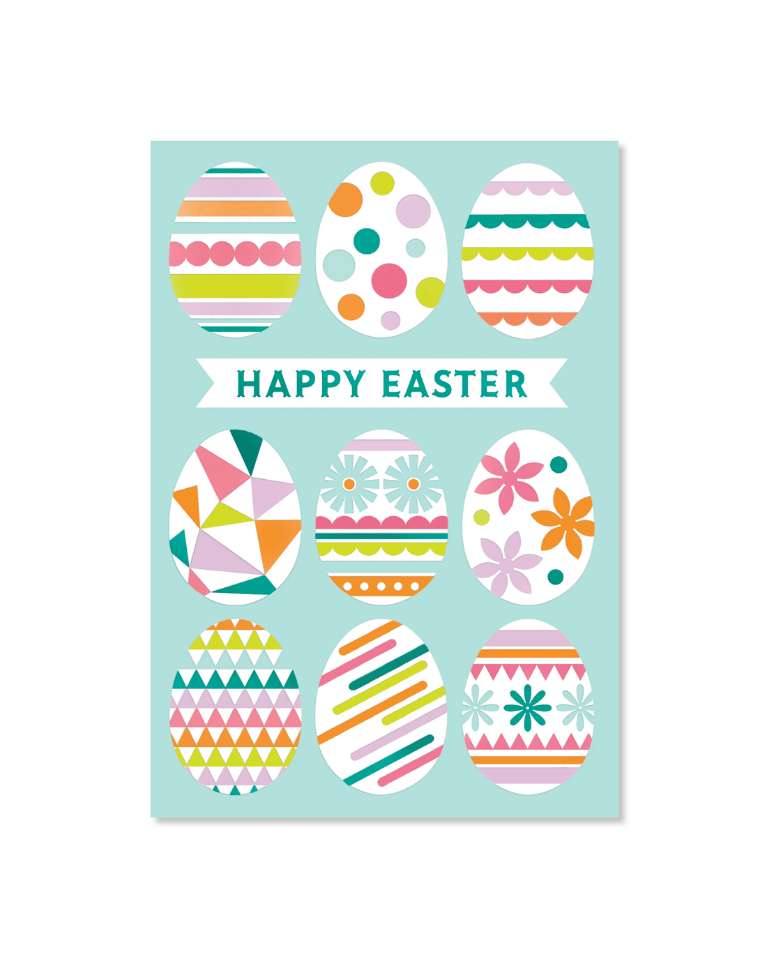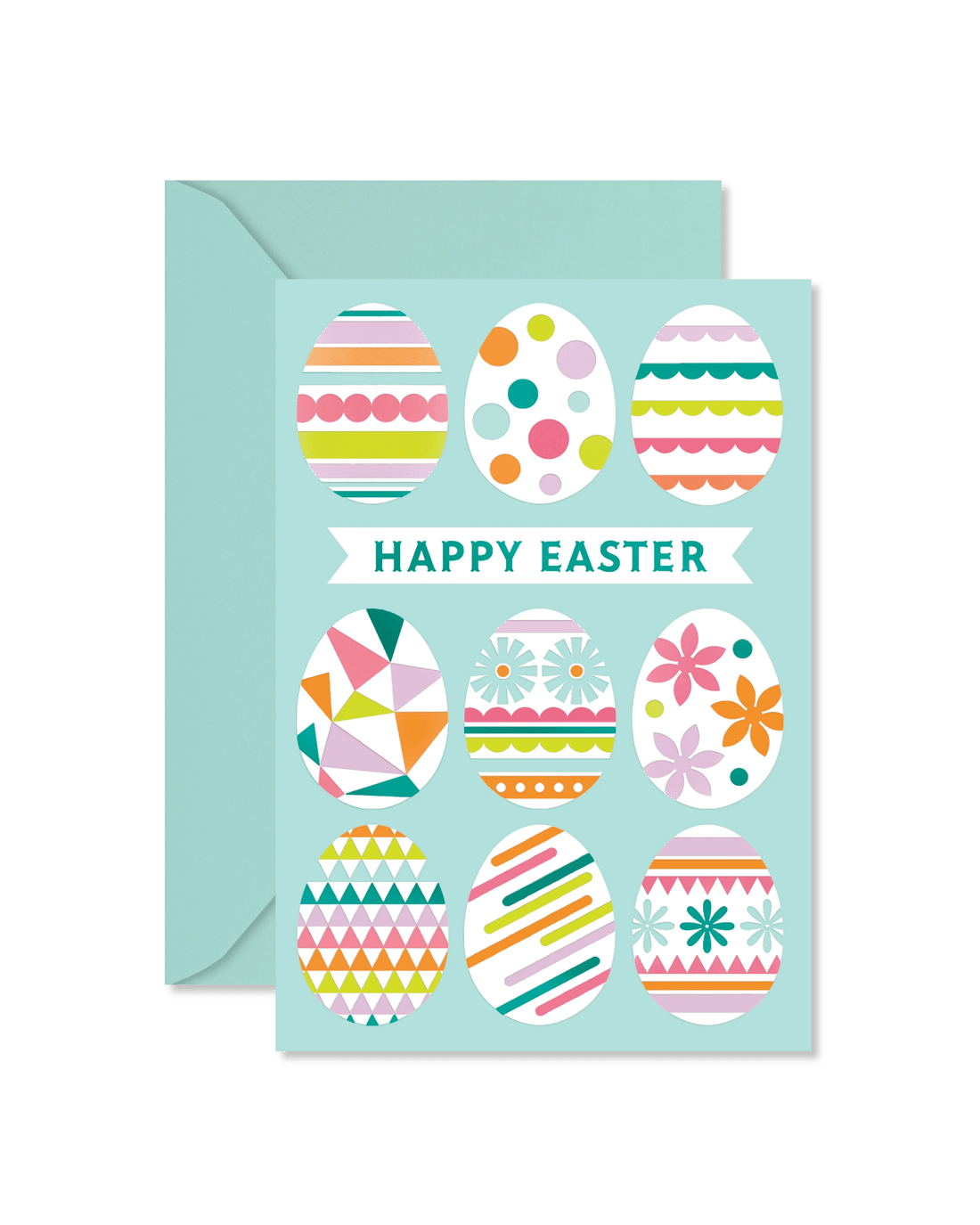 • The front of the card features blue foil highlights, embossed elements, colourful illustrations of patterned Easter eggs, and the message 'Happy Easter'