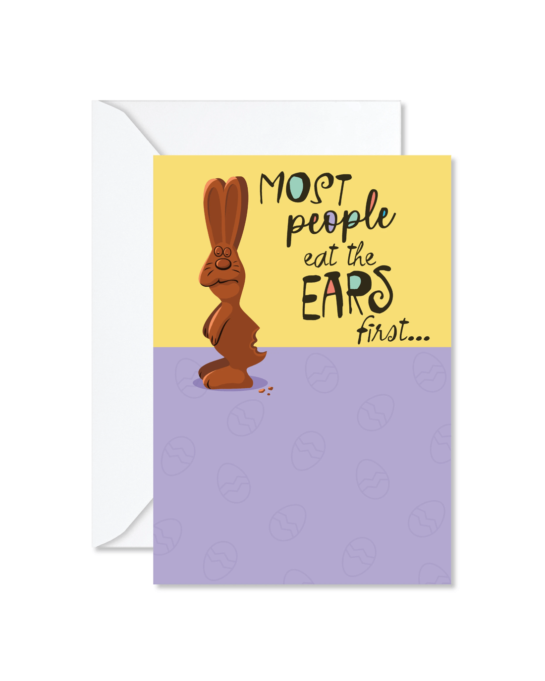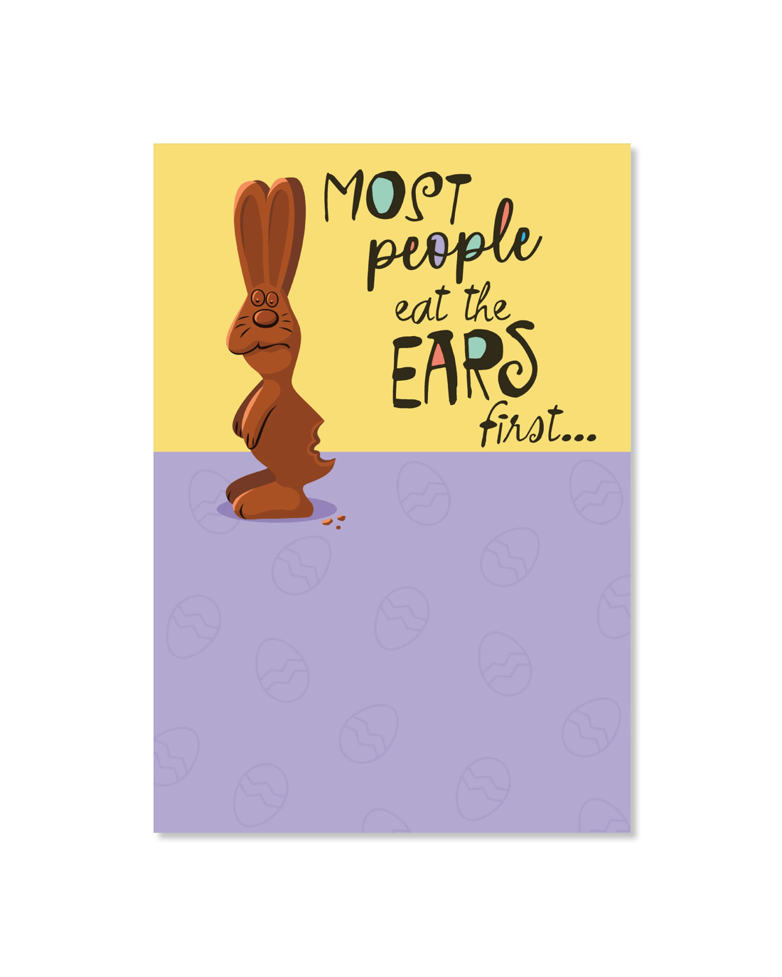 • The front of the card features an illustration of a chocolate Easter rabbit with a bite out of its bottom alongside the message, 'MOST people eat the EARS first...'