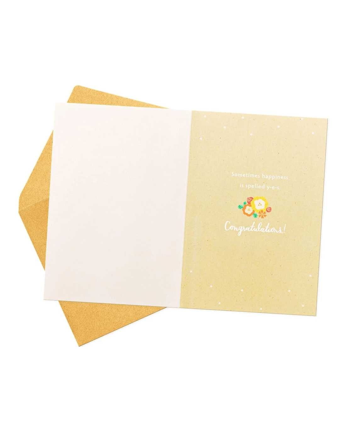 • Inside message reads 'Sometimes happiness is spelt y-e-s. Congratulations!'