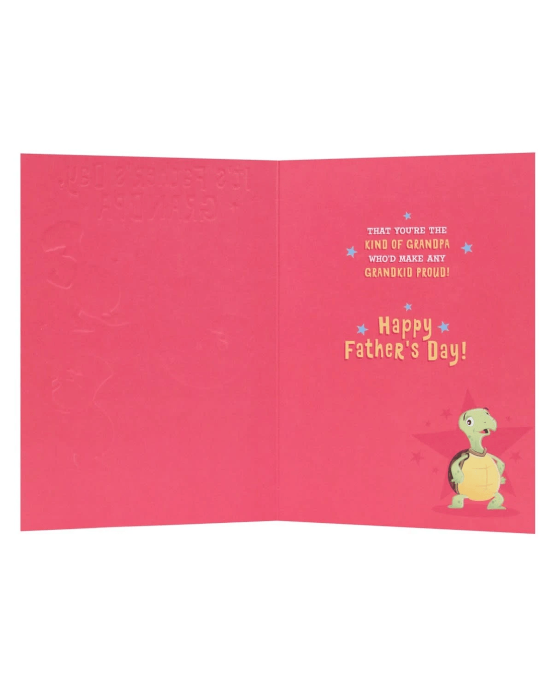 • The inside of the card features an illustration of a tortoise surrounded by stars alongside the message 'THAT YOU’RE THE KIND OF GRANDPA WHO’D MAKE ANY GRANDKID PROUD! Happy FatheR’s Day!'