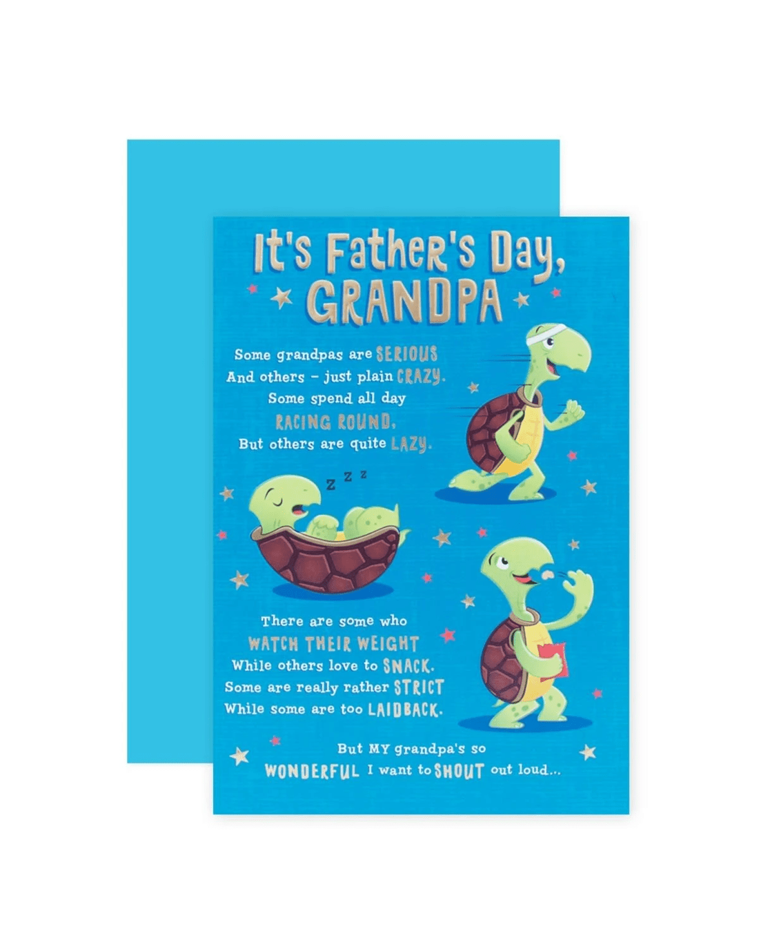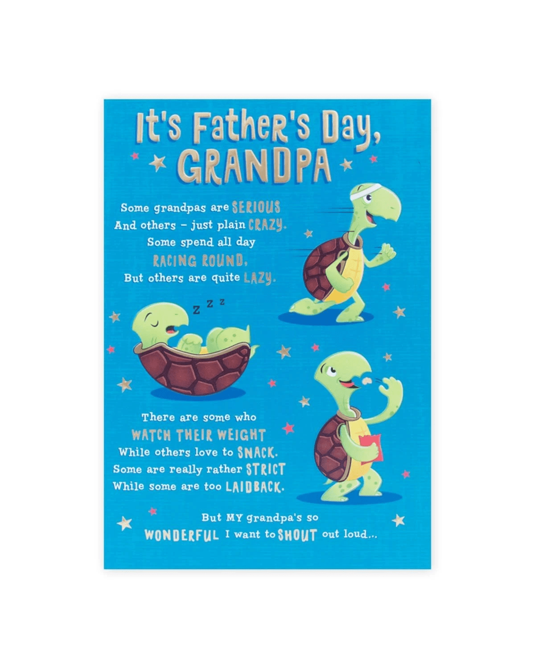 • The front of the card features gold foil highlights, embossed elements and illustrations of a running tortoise, a sleeping tortoise and a tortoise eating chips surrounded by stars alongside the message 'It’s FatheR’s Day, GRANDPA Some grandpas are SERIOUS And others – just plain CRAZY. Some spend all day RACING ROUND, But others are quite LAZY. There are some who WATCH THEIR WEIGHT While others love to SNACK. Some are really rather STRICT While some are too LAIDBACK. But MY grandpa’s so WONDERFUL I want to SHOUT out loud…'