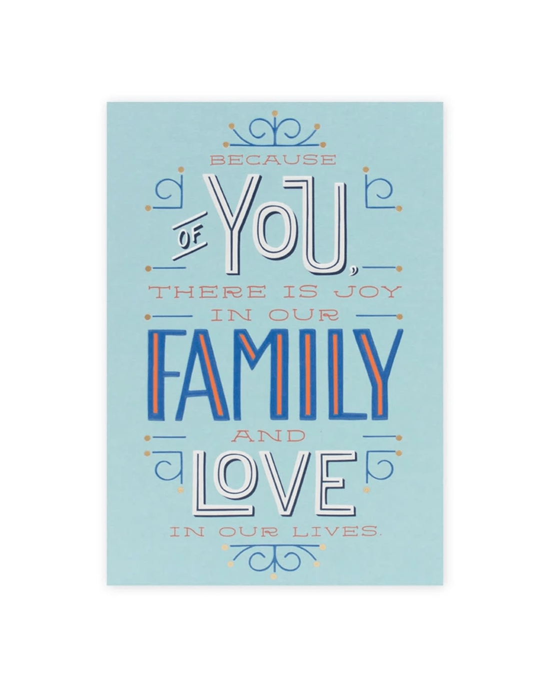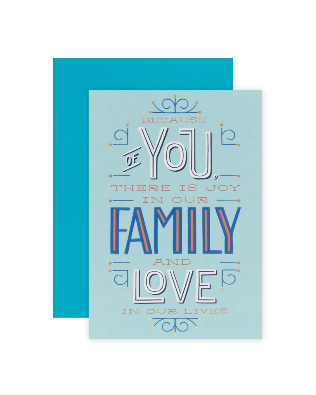 • The front of the card features gold foil highlights, embossed elements, illustrated flourishes and the message 'BECAUSE OF YOU, THERE IS JOY IN OUR FAMILY AND LOVE IN OUR LIVES.'