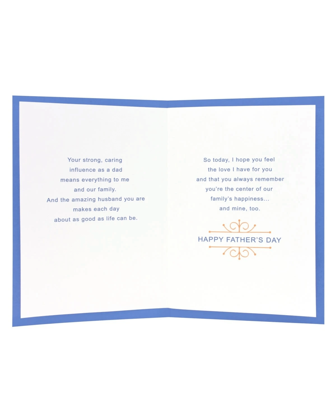 • The inside of the card features a leaflet-style design with illustrated flourishes alongside the message 'Your strong, caring influence as a dad means everything to me and our family. And the amazing husband you are makes each day about as good as life can be. So today, I hope you feel the love I have for you and that you always remember you’re the center of our family’s happiness… and mine, too. HAPPY FATHER’S DAY'