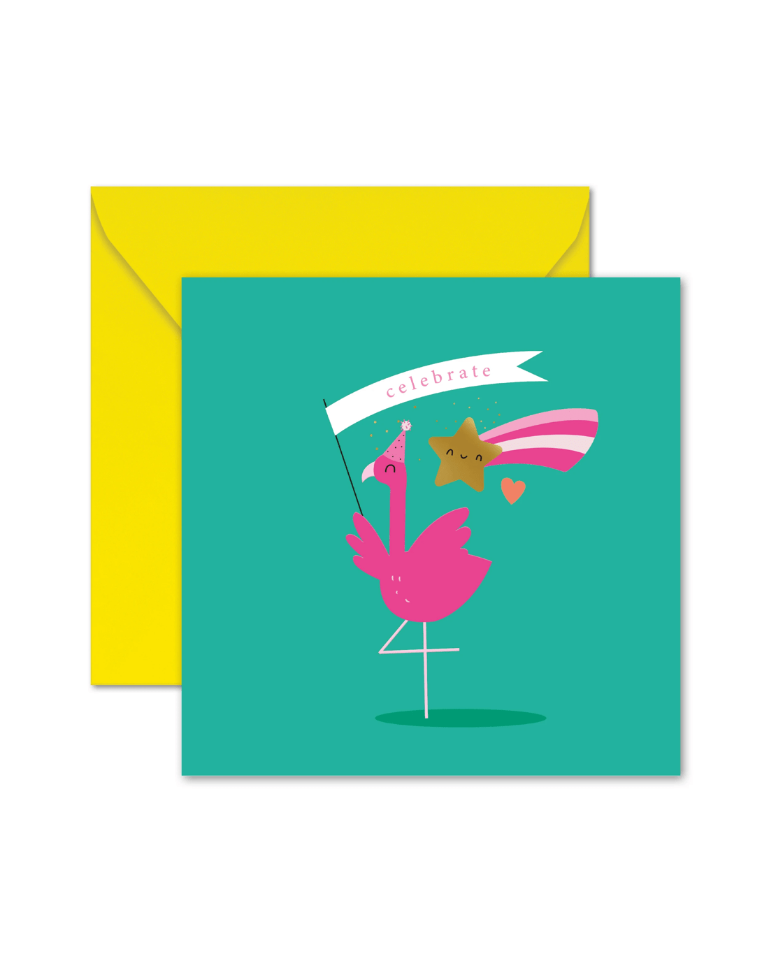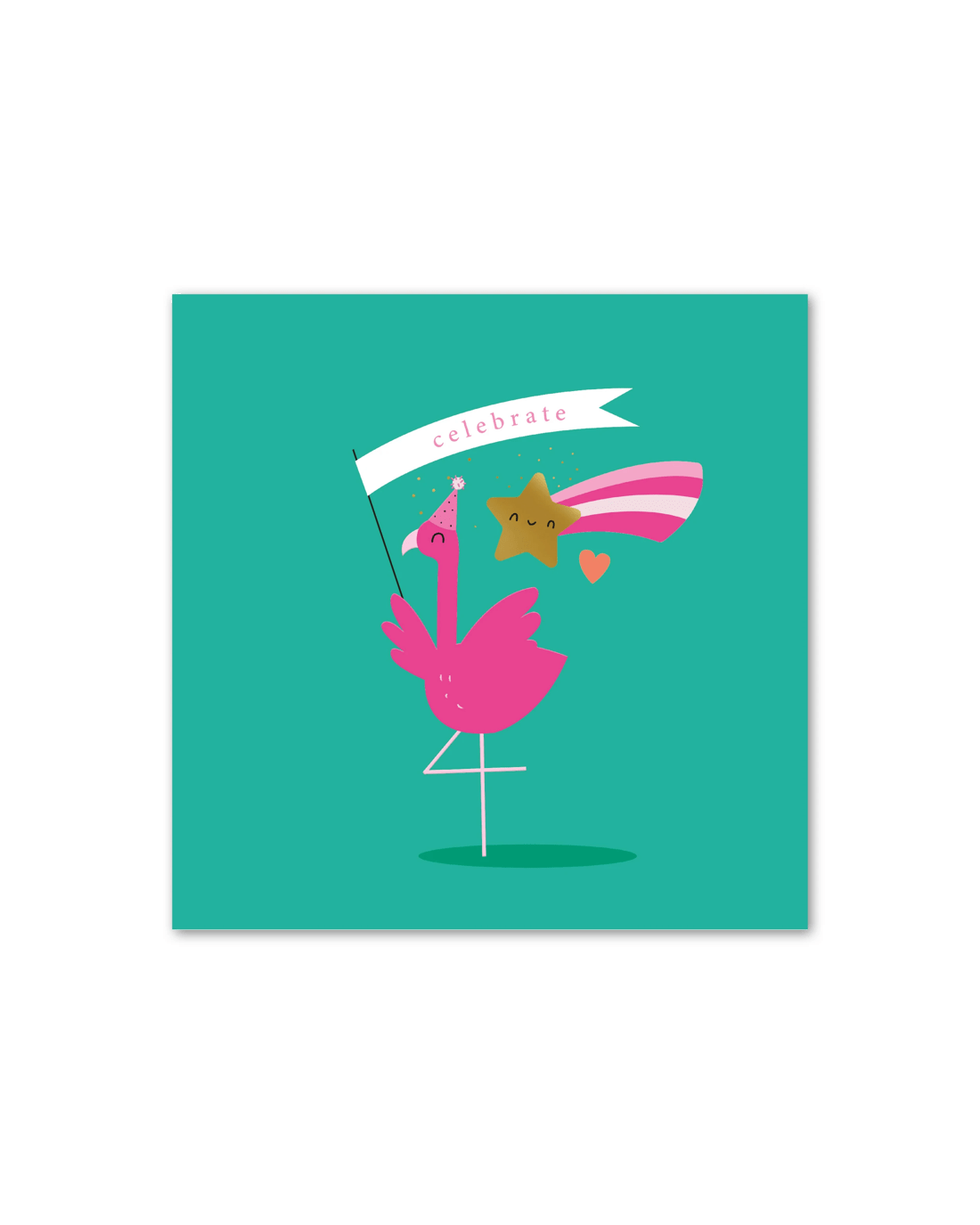 • The front of the card features gold foil highlights, embossed elements and an illustration of a flamingo wearing a party hat holding a flag with the message, 'Celebrate'