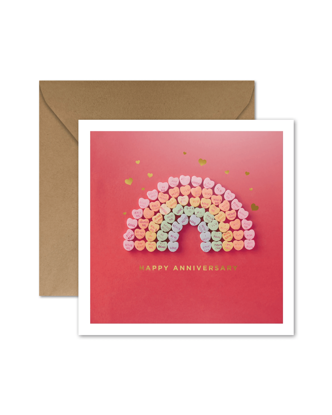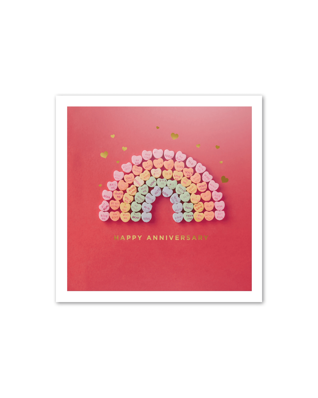 • The front of the card features gold foil highlights, embossed elements, a photograph of colourful candy hearts in the shape of a rainbow and the message 'HAPPY ANNIVERSARY'