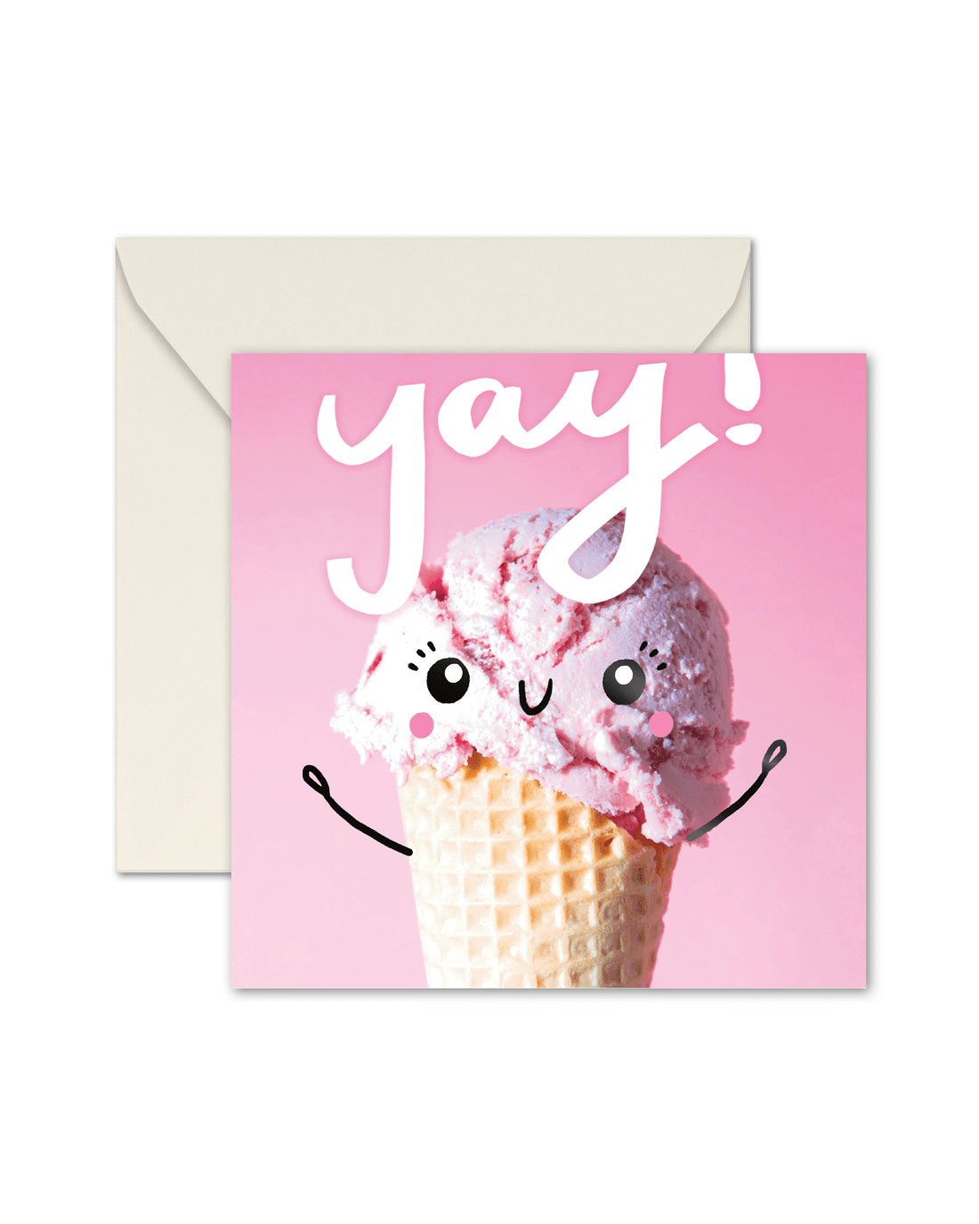 • The front of the card features black foil highlights, a photo of a scoop of pink ice cream in a cone with an illustrated smiling face and arms and the message 'Yay!'