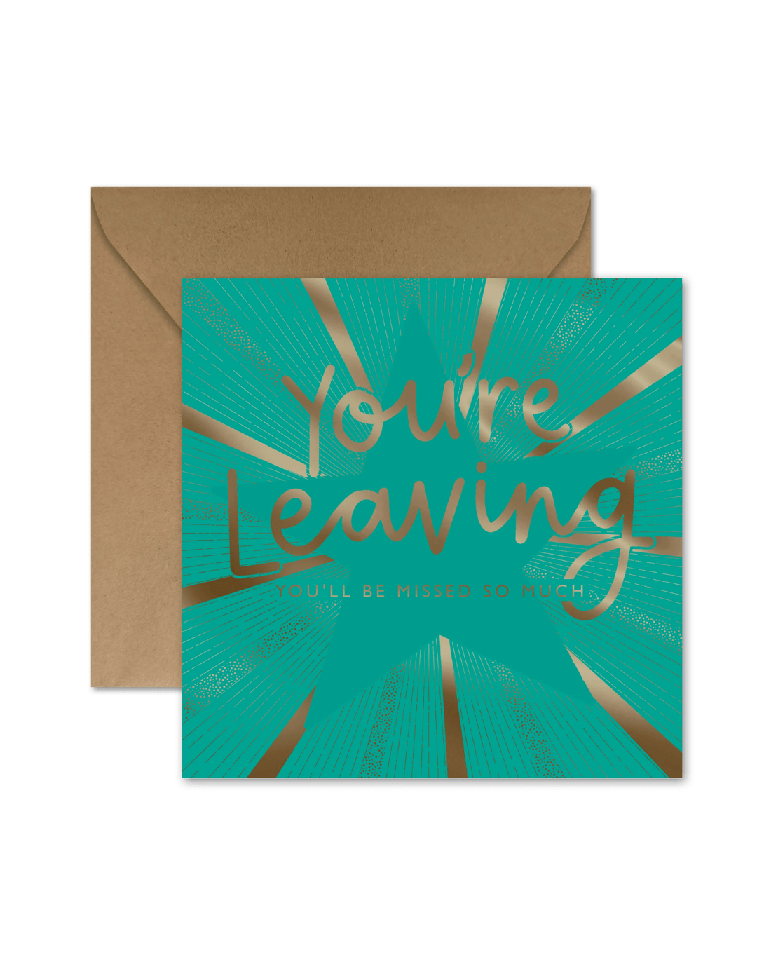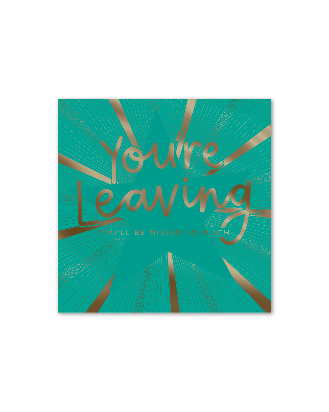 • The front of the card features gold foil highlights, an illustration of a shining star and the message 'You're leaving. YOU'LL BE MISSED SO MUCH'