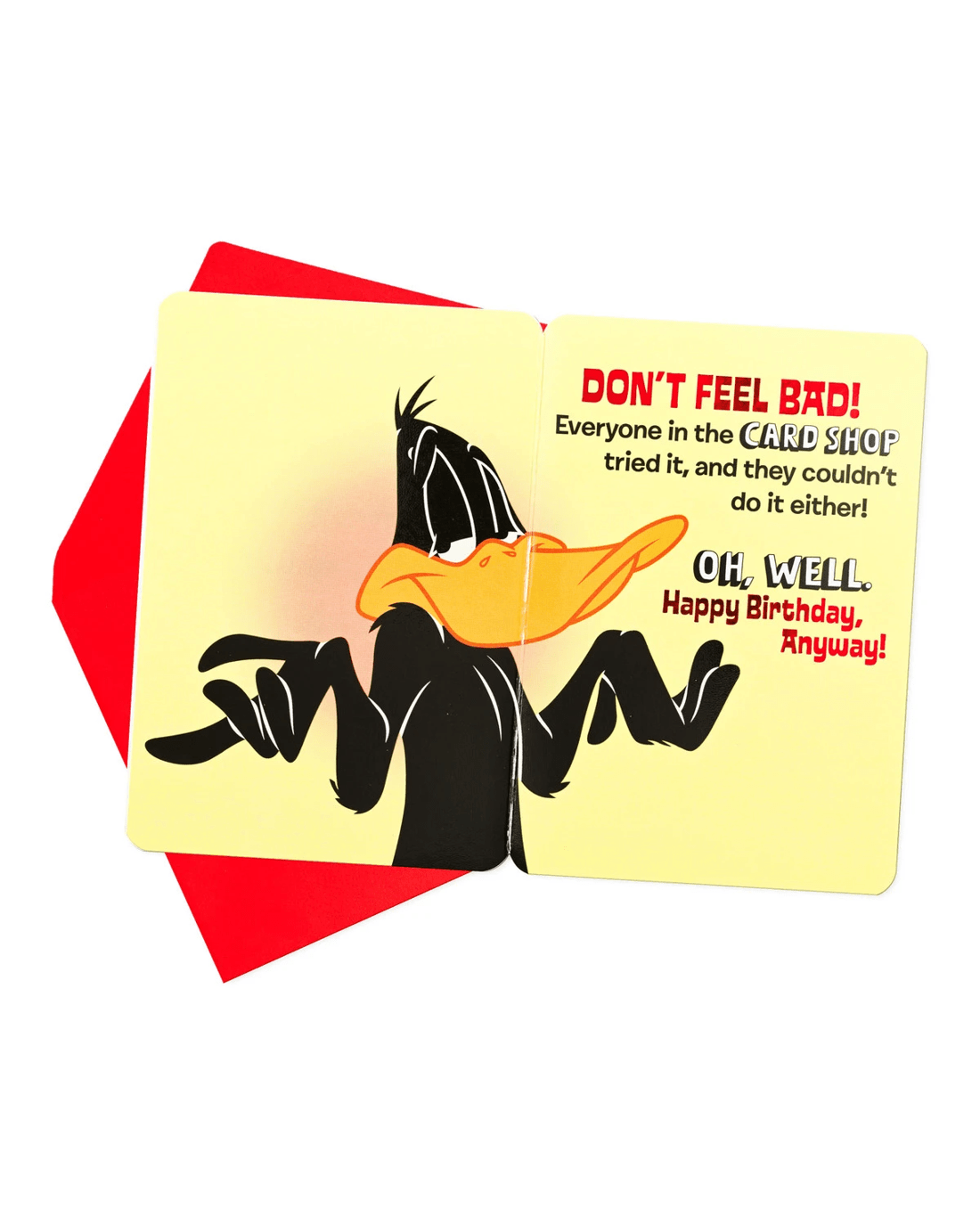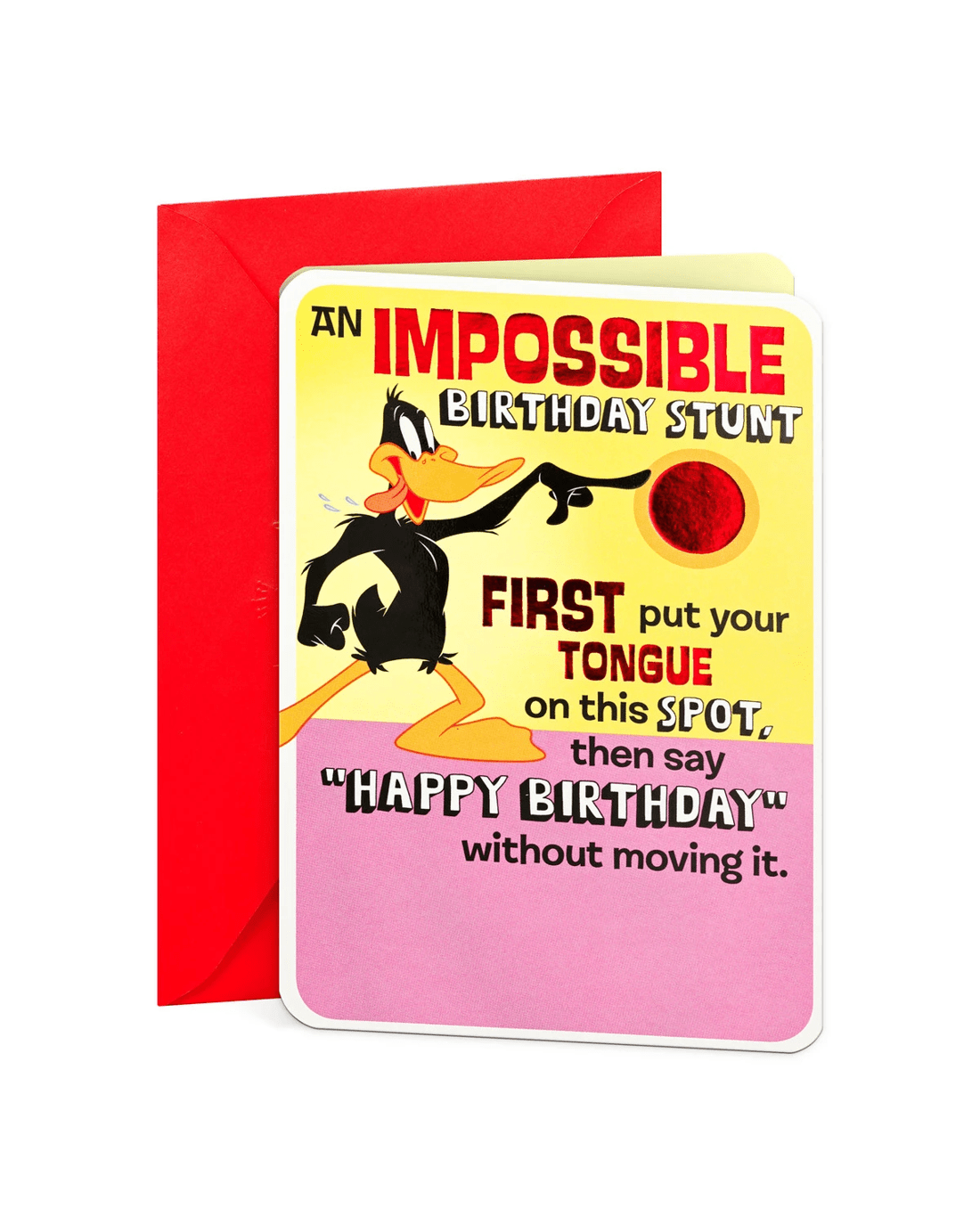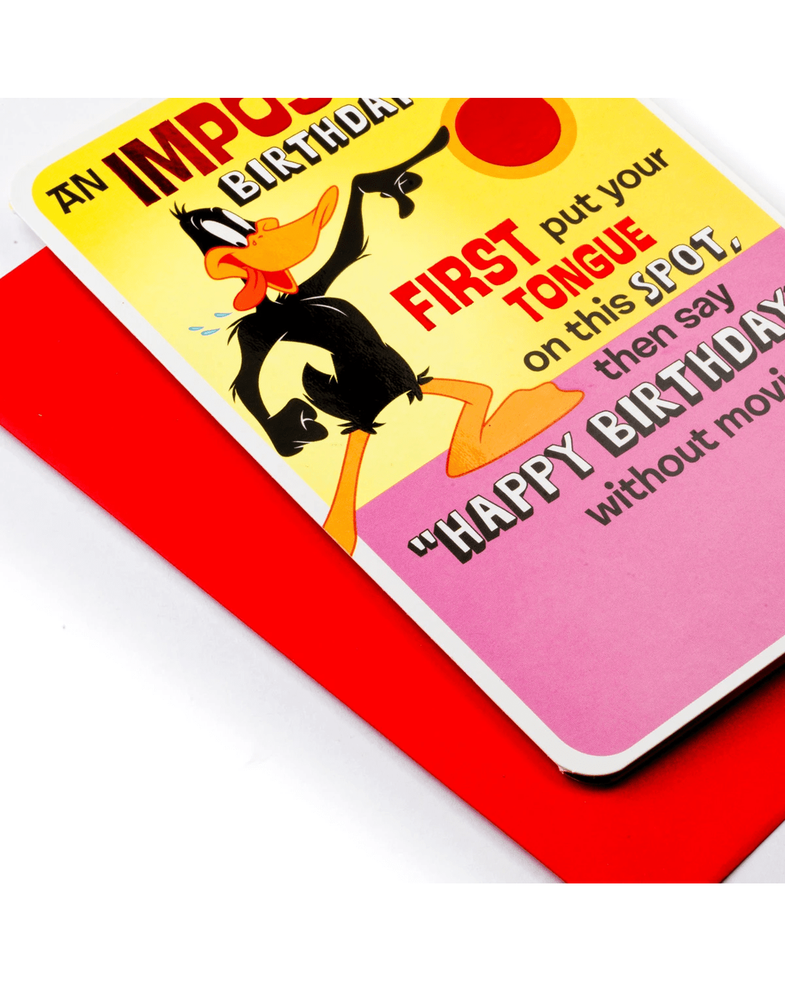 • The front cover features red foil detail and an image of Daffy Duck with message: An impossible birthday stunt. First put your tongue on this spot, then say Happy Birthday without moving it.