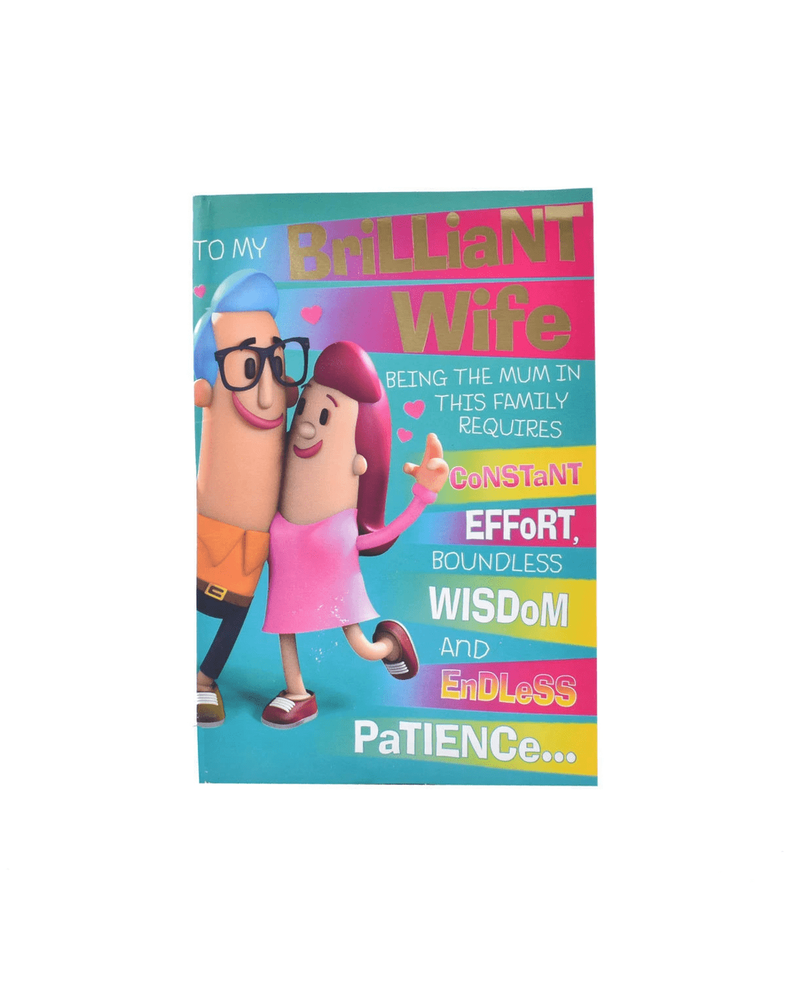 • The front of the card features a colourful design of a cartoon couple with gold foil highlights and the message 'TO MY BRILLIANT WIFE BEING THE MUM IN THE FAMILY REQUIRES CONSTANT EFFORT, BOUNDLESS WISDOM AND ENDLESS PATIENCE…'