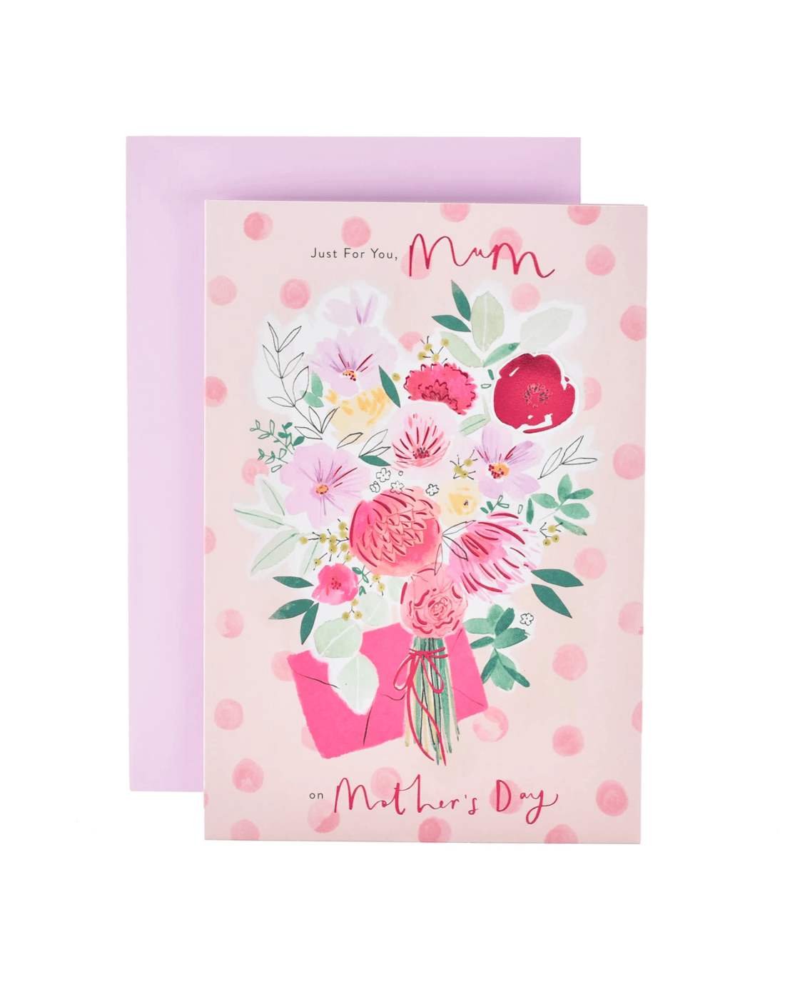 • The front of the card features an illustration of a colourful bouquet of flowers, pink foil highlights, a 3D plaque attachment, and the message 'Just For You, Mum on Mother’s Day'
