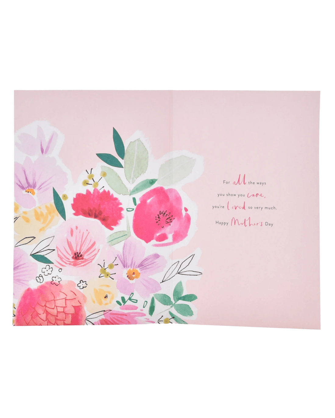 • The inside of the card features colourful floral illustrations alongside the message 'For all the ways you show you care, you’re loved so very much. Happy Mother’s Day'
