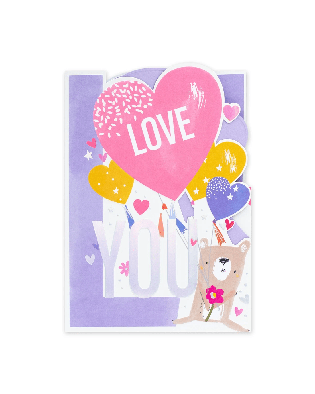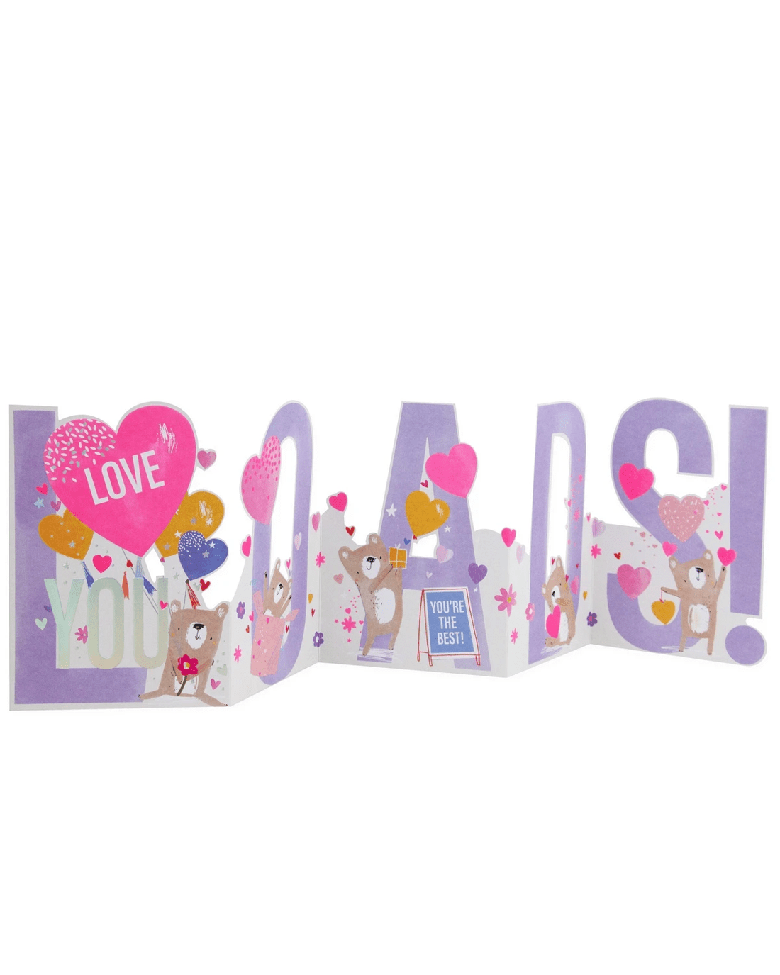 • The front of the card features a multifold die cut design with embossed elements, silver holographic highlights, neon inks, adorable illustrations of bears surrounded by love hearts and the message 'LOVE YOU LOADS!'