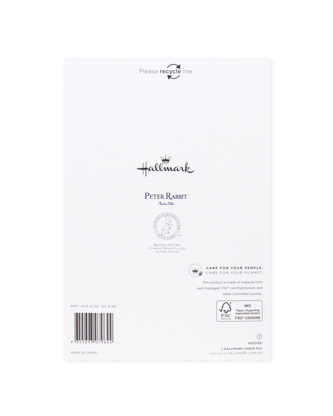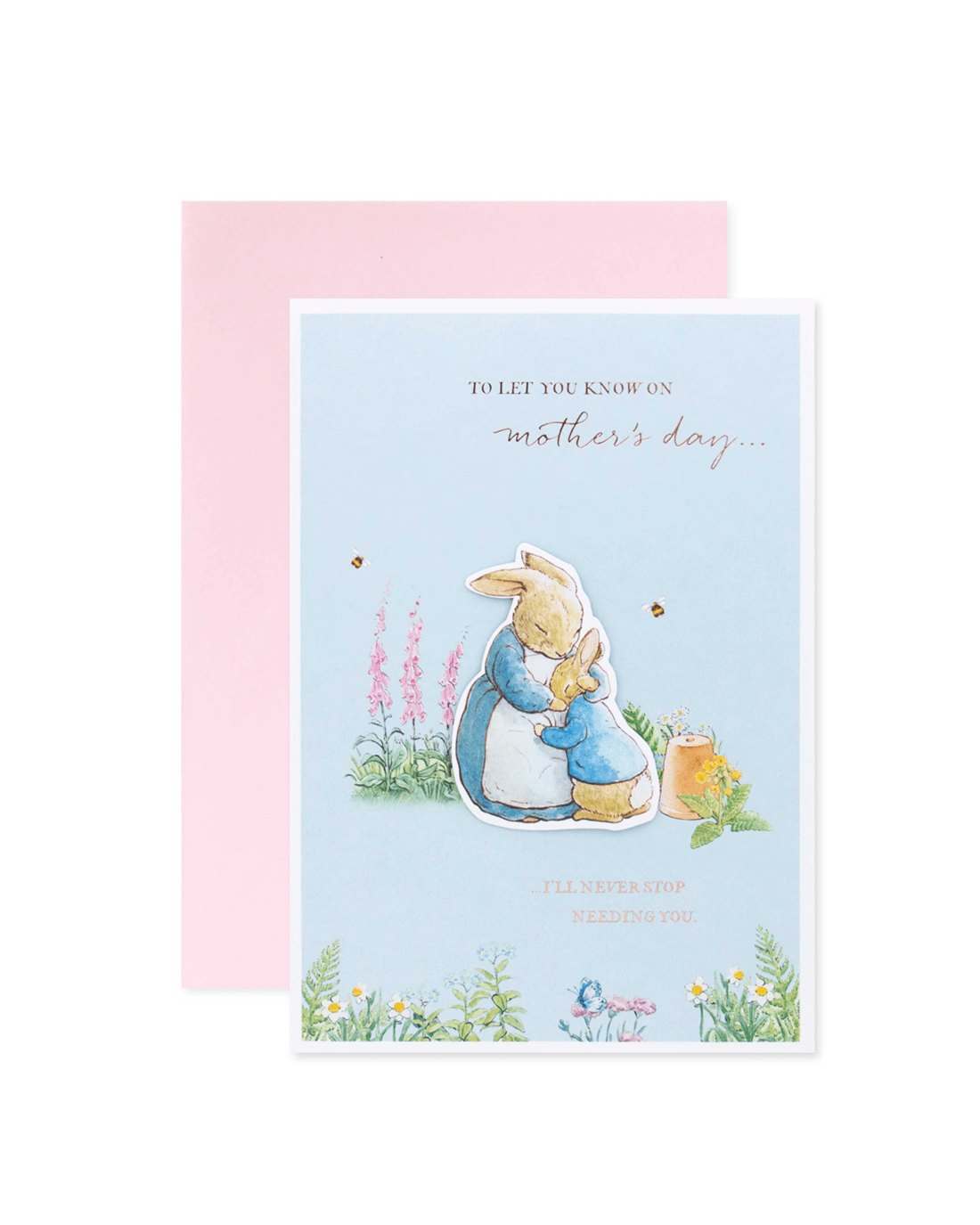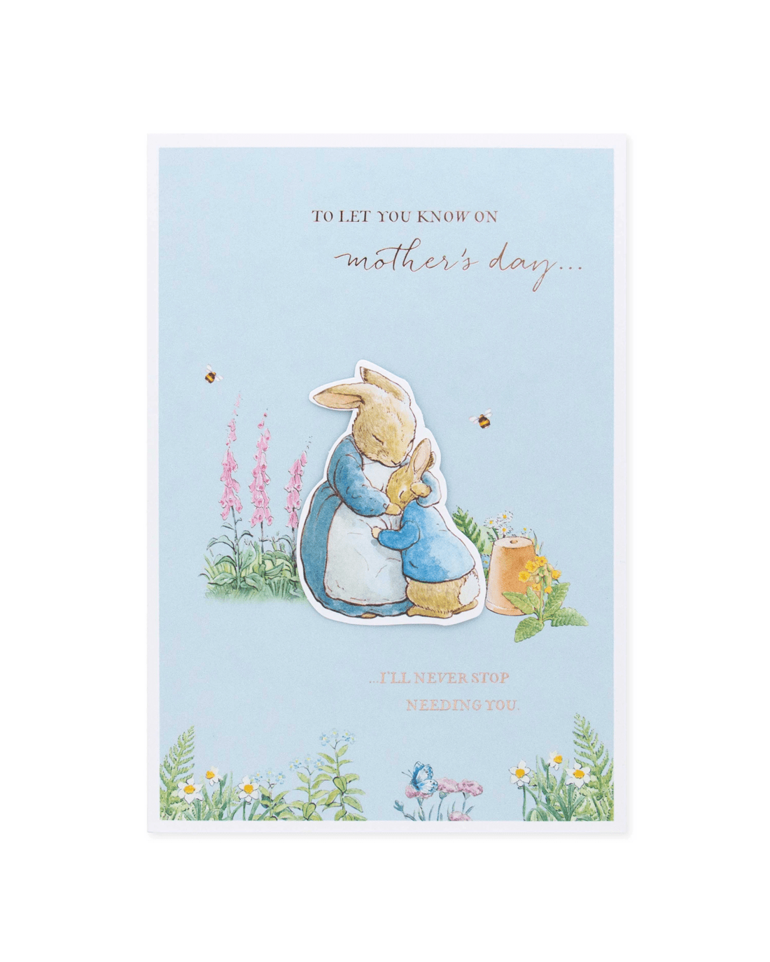 • The front of the card features rose gold foil highlights, a 3D plaque attachment, beautiful illustrations of Peter Rabbit hugging Mrs Rabbit amongst a blooming garden, and the message 'TO LET YOU KNOW ON mother's day... ...I'LL NEVER STOP NEEDING YOU.'