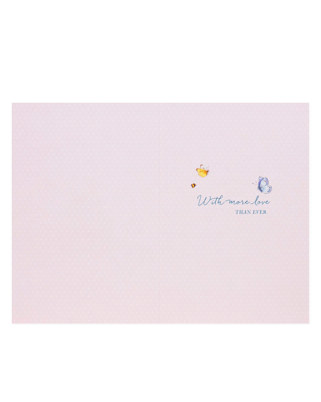 • The inside of the card is illustrated with polka dots, butterflies and a bee alongside the message 'With more love THAN EVER'