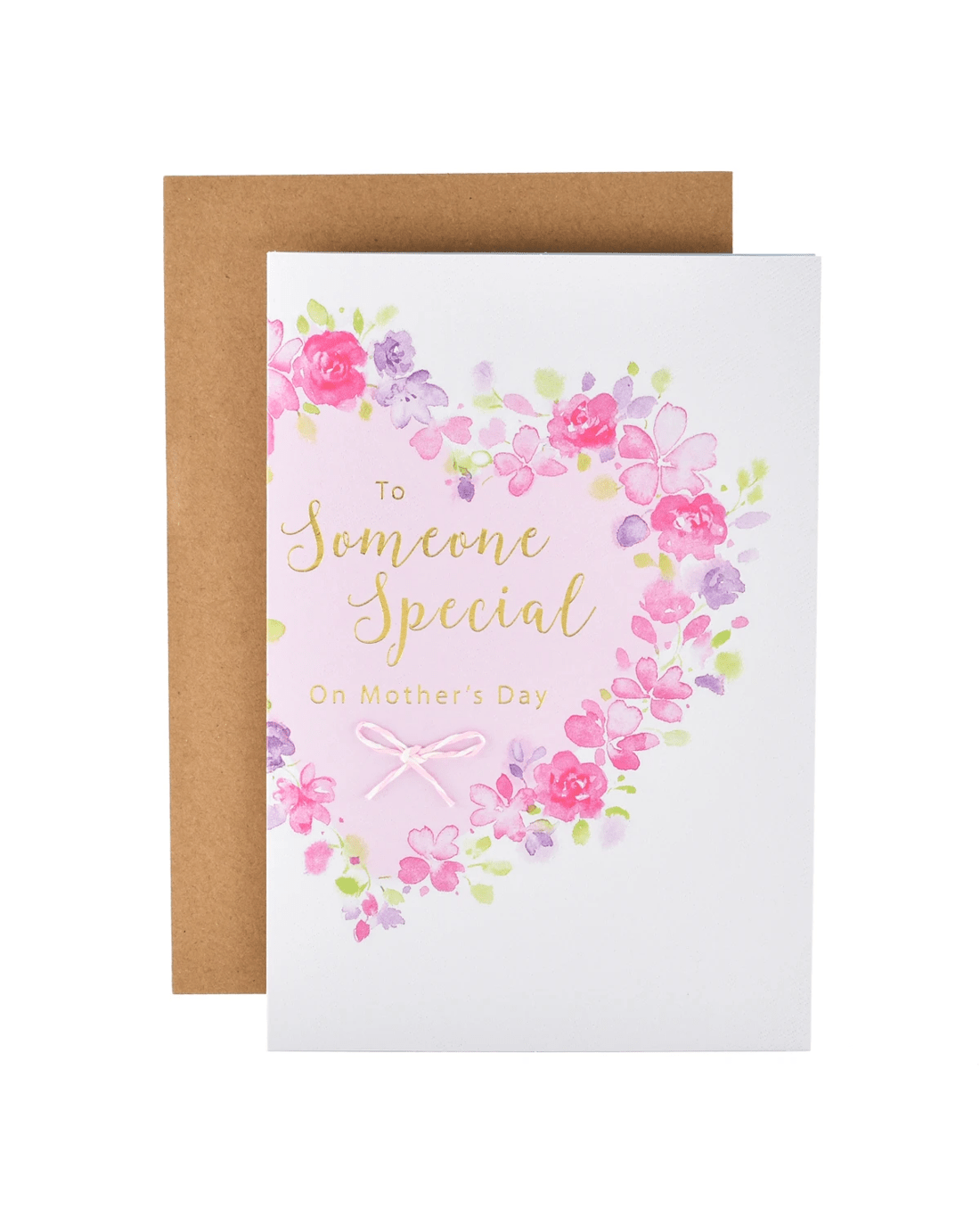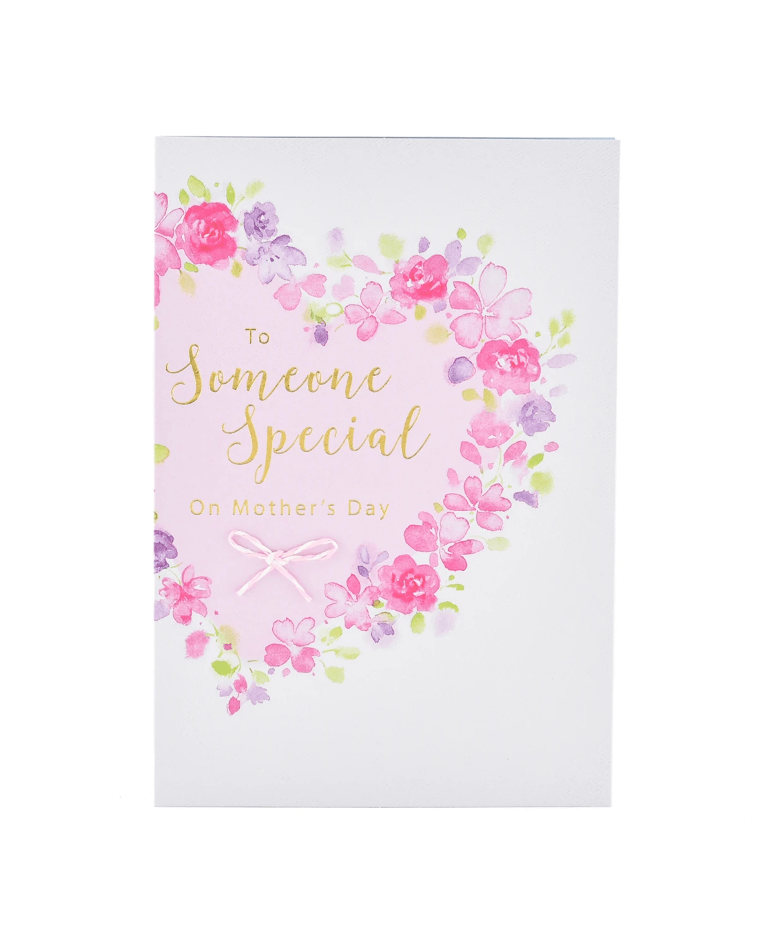 • The front of the card features gold foil highlights, a 3D bow attachment, embossed elements, and the message 'To Someone Special On Mother's Day'